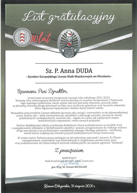 Komendant Nadodrzańskiego Oddziału Straży Granicznej gen. bryg SG Tomasz Michalski przesłał na ręce dyrekcji trzech szkół średnich a mianowicie Zespołu Szkół Technicznych i Ogólnokształcących w Gorzowie Wielkopolskim, Centrum Kształcenia Zawodowego i Ustawicznego "Elektryk" w Nowej Soli, Europejskiego Liceum Służb Mundurowych we Wrocławiu listy gratulacyjne.