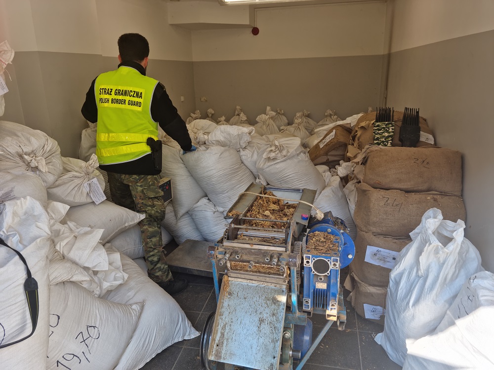 Funkcjonariusze z Placówki Straży Granicznej w Jeleniej Górze, w wyniku przeszukania pomieszczeń garażowych znajdujących się w jednej z miejscowości powiatu karkonoskiego ujawnili 70 worków z krajanką tytoniową. Towar ważący blisko półtora tony o czarnorynkowej wartości ponad miliona złotych oraz 270 kilogramów liści tytoniu o szacunkowej wartości prawie 123 tysięcy złotych, nie posiadał polskich znaków akcyzy skarbowej. W jednym z garaży funkcjonariusze SG zabezpieczyli maszynę do cięcia tytoniu wraz z nożami oraz wagę elektroniczną. Do sprawy zatrzymano także trzech Polaków, których zastano w miejscu ujawnienia tytoniu.