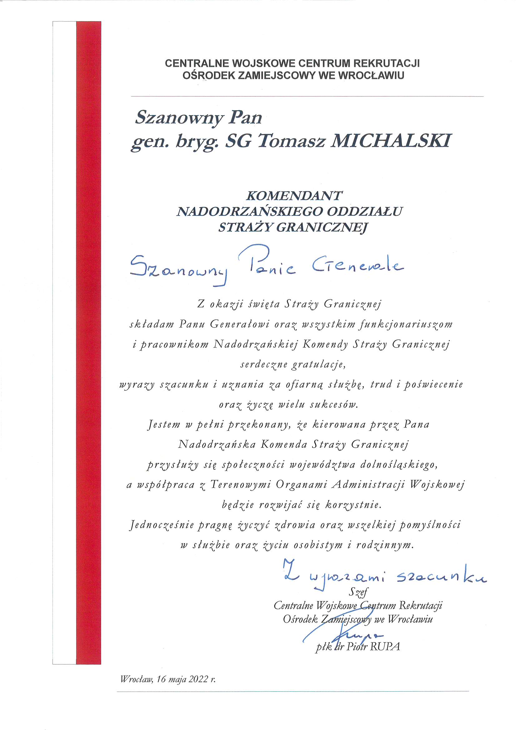 Życzenia skierowane przez Szefa Centralnego Wojskowego Centrum Rekrutacji Ośrodek Zamiejscowy we Wrocławiu -