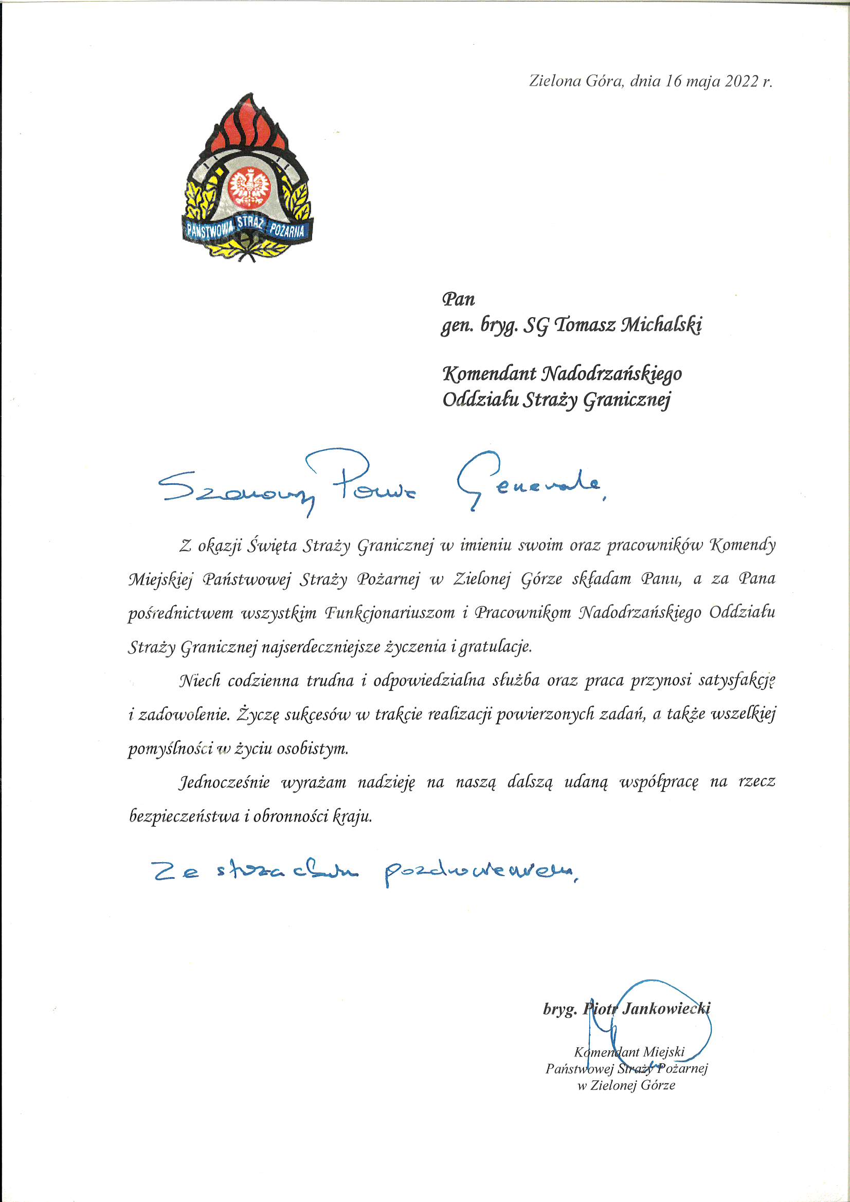 Życzenia skierowane przez Komendanta Miejskiego PSG w Zielonej Górze -