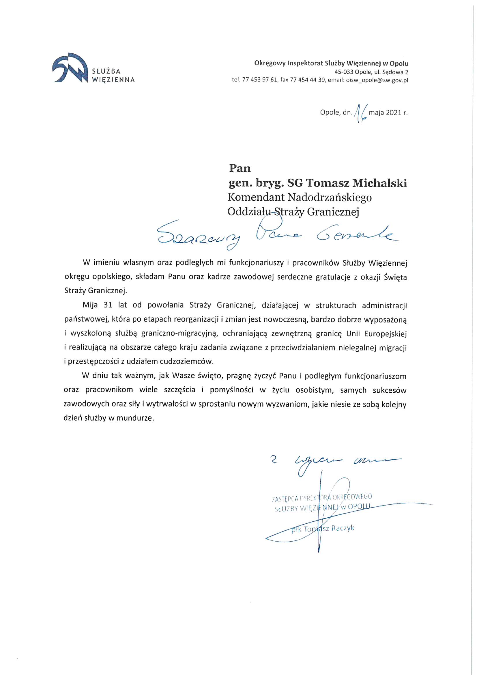 Życzenia skierowane przez Zastępcę Dyrektora Okręgowego Służby Więziennej w Opolu -