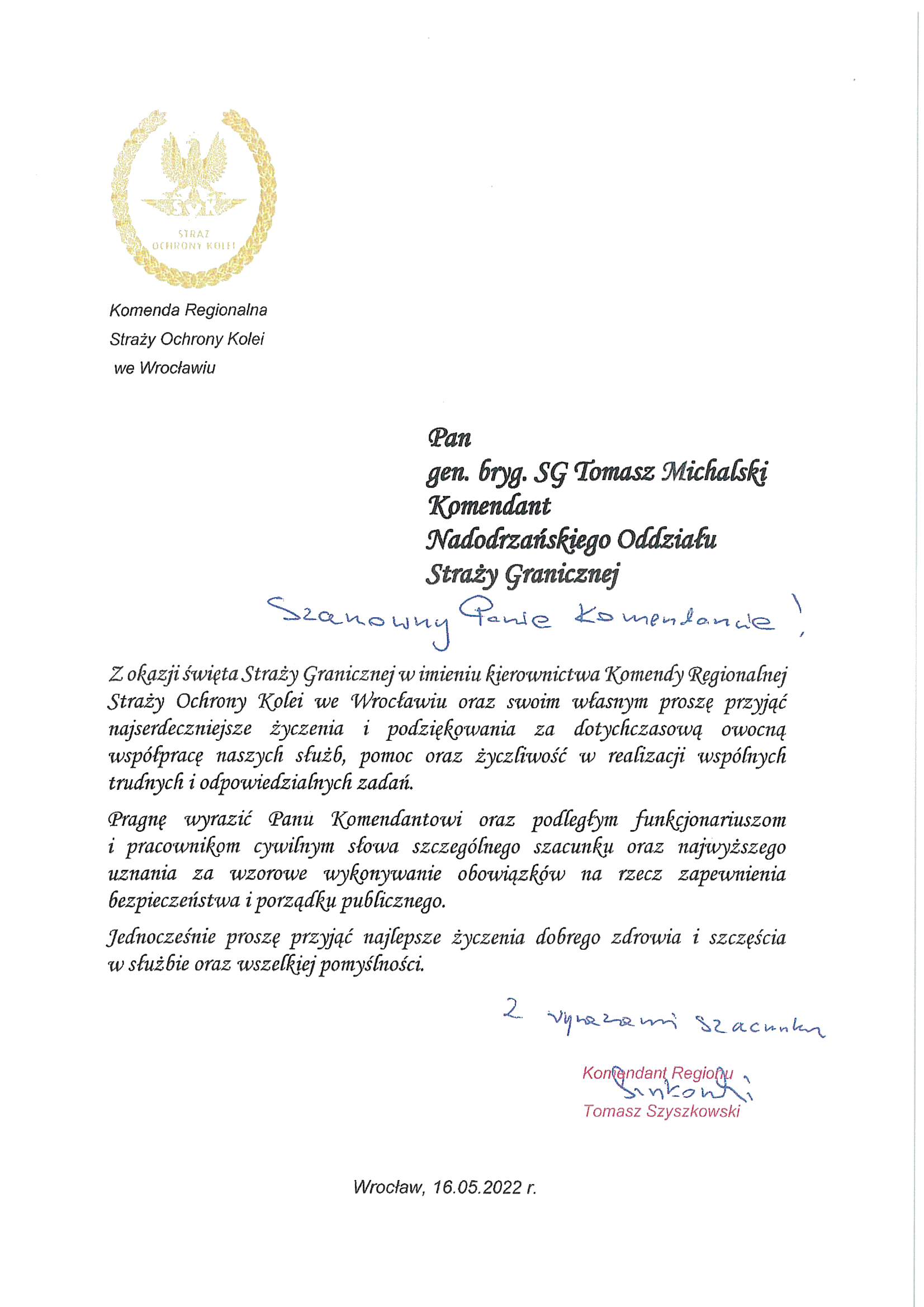 Życzenia skierowane przez Komendanta Regionu SOK we Wrocławiu -