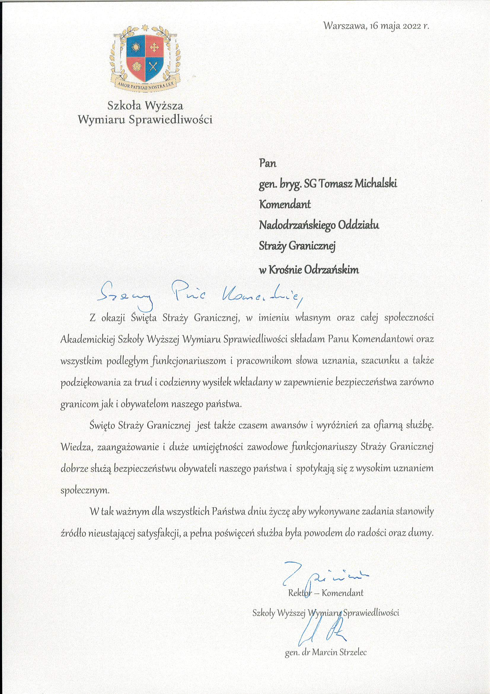 Życzenia skierowane przez Rektora - Komendanta Szkoły Wyższej Wymiaru Sprawiedliwości -