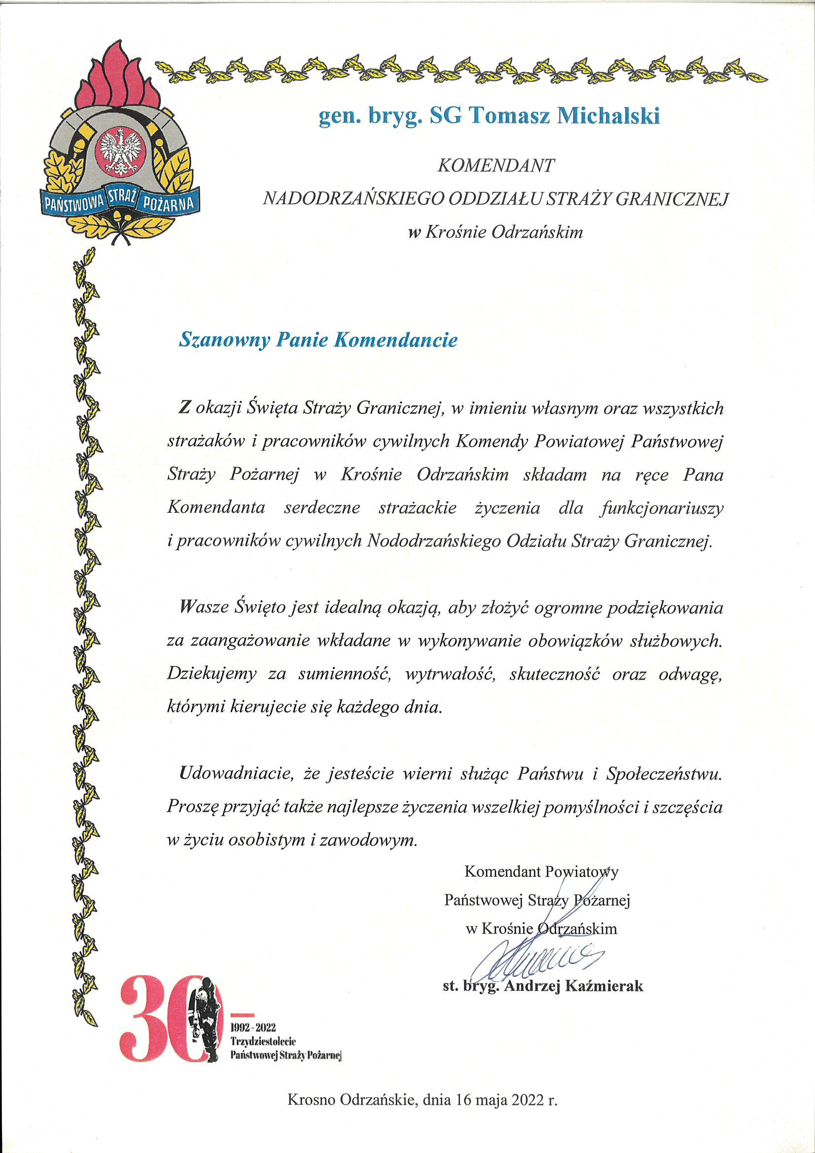 Życzenia skierowane przez Komendanta Powiatowego PSP w Krośnie Odrzańskim -