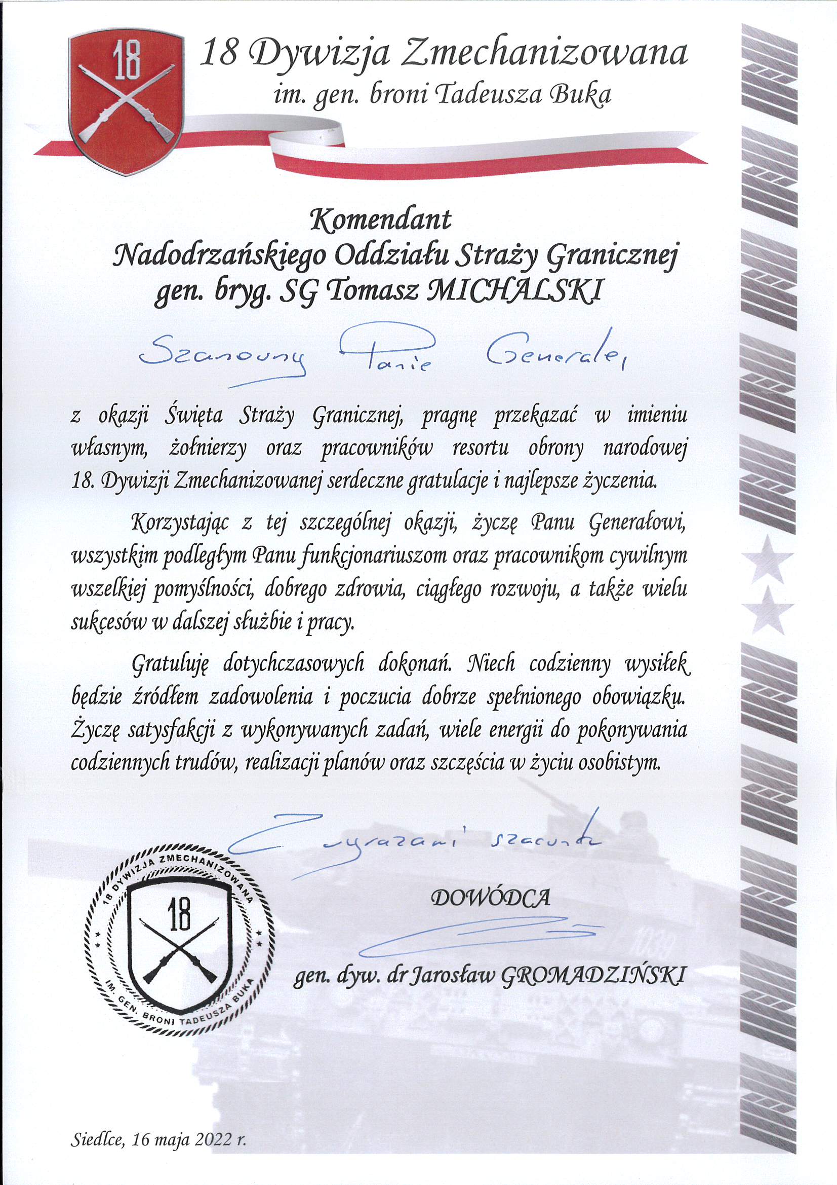 Życzenia skierowane przez Dowódcę 18 Dywizji Zmechanizowanej -