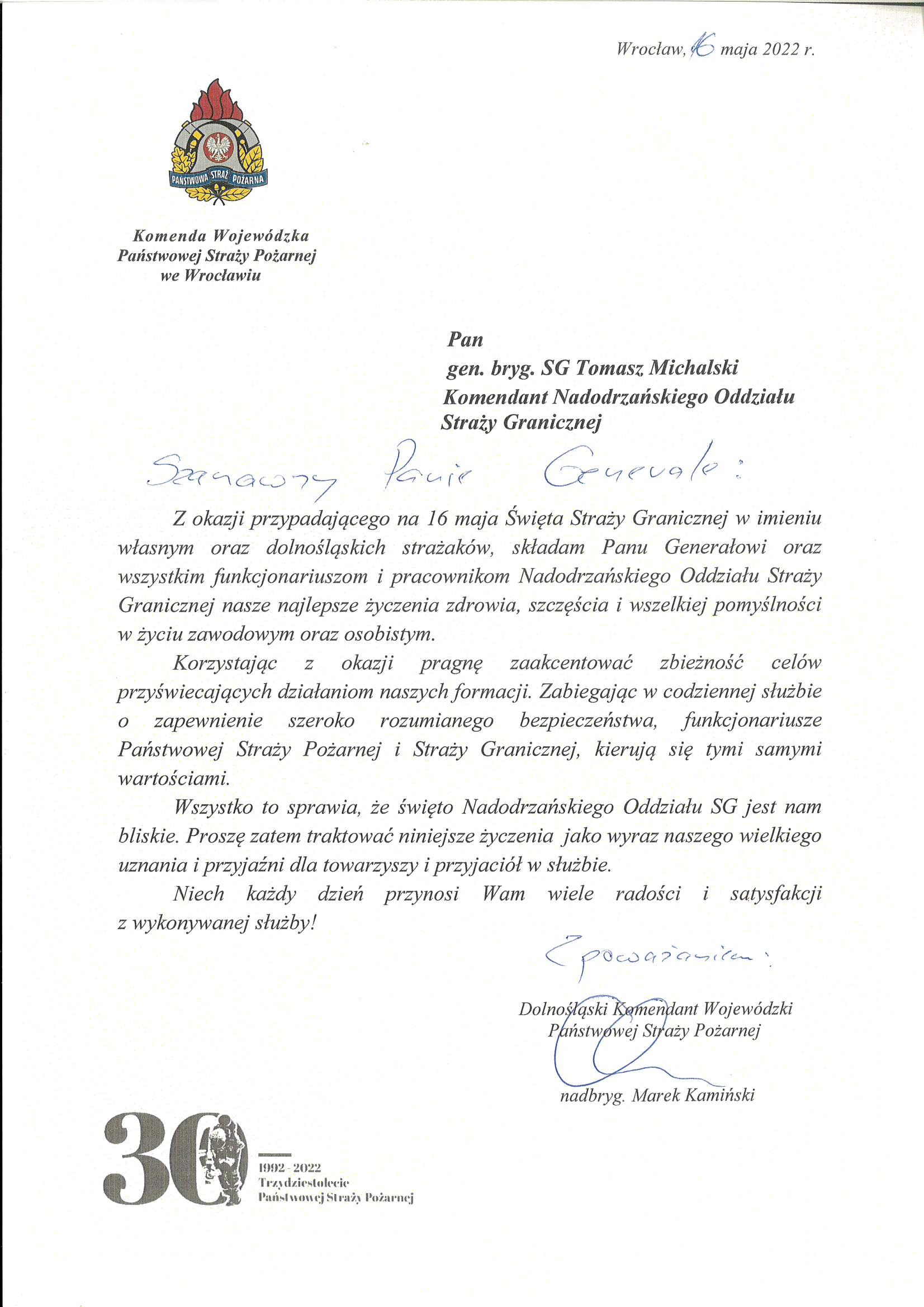 Życzenia skierowane przez Dolnośląskiego Komendanta Wojewódzkiego PSP -