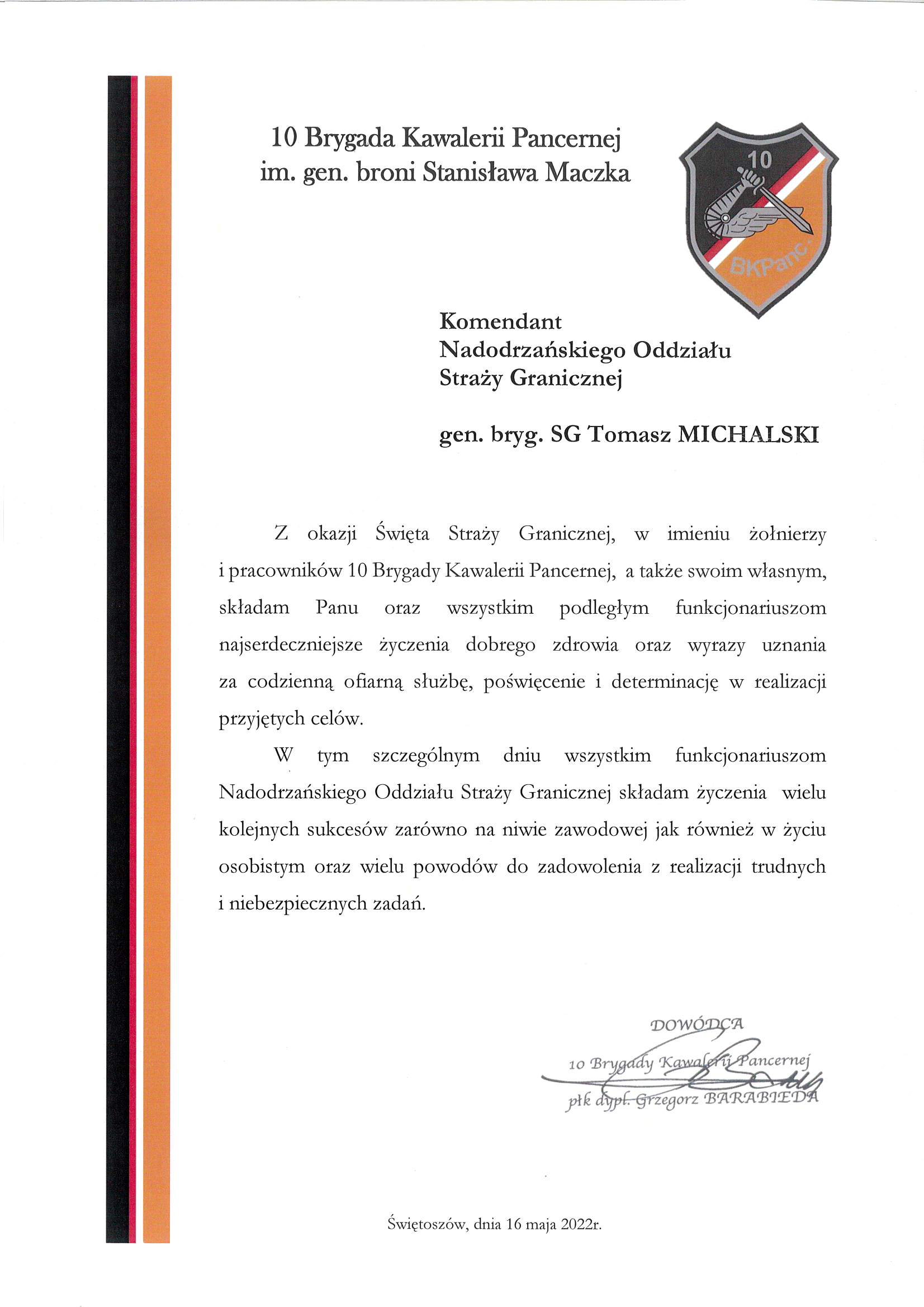 Życzenia skierowane przez Dowódcę 10 Brygady Kawalerii Pancernej -