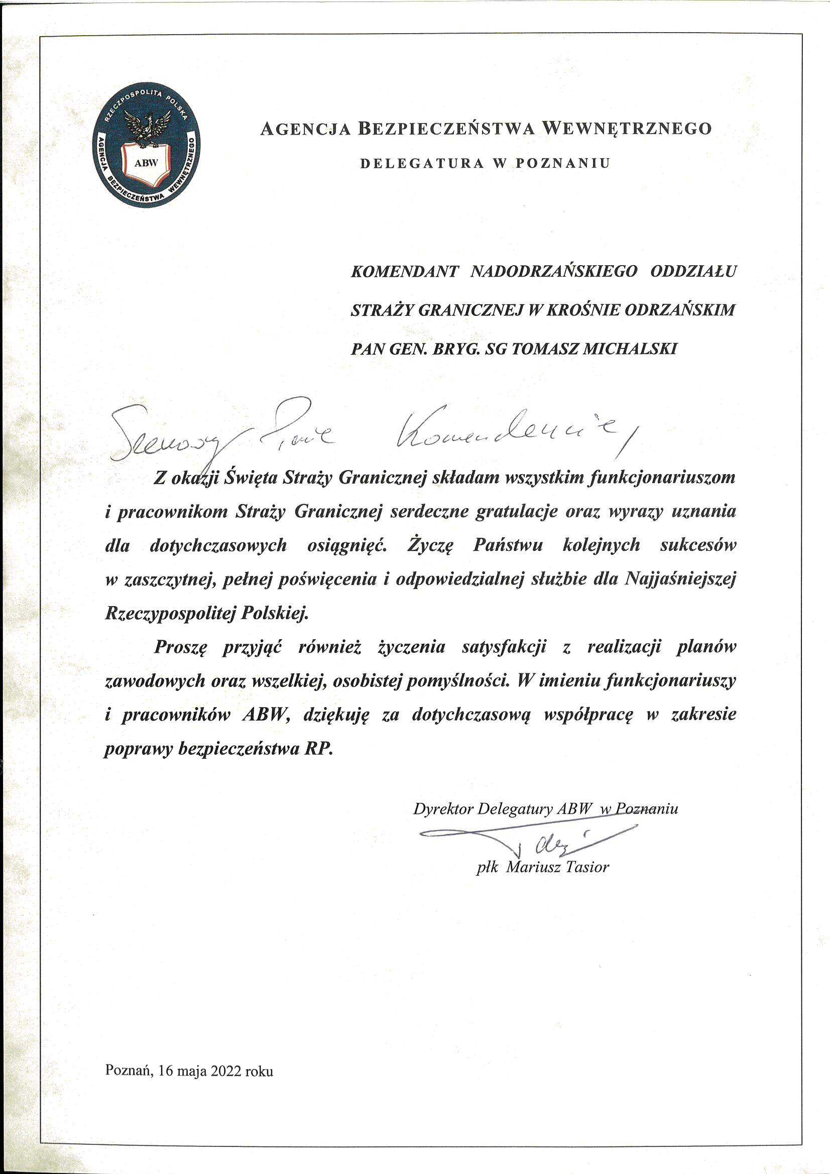 Życzenia skierowane przez Dyrektora Delegatury Agencji Bezpieczeństwa Wewnętrznego w Poznaniu -