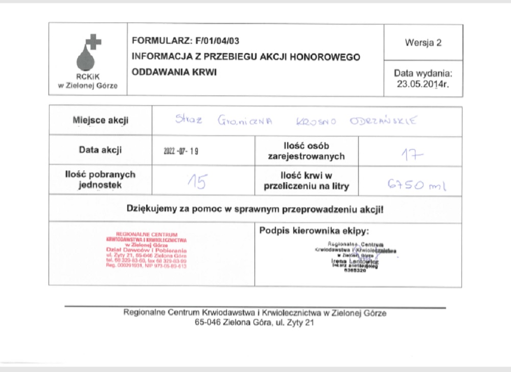 Poniedziałkowe pobieranie krwi w Nadodrzańskim Oddziale SG zorganizował personel medyczny z Regionalnego Centrum Krwiodawstwa i Krwiolecznictwa w Zielonej Górze. Z 17 osób do oddania krwi zakwalifikowało się 15. W ten sposób zebraliśmy 6,75 litra krwi.