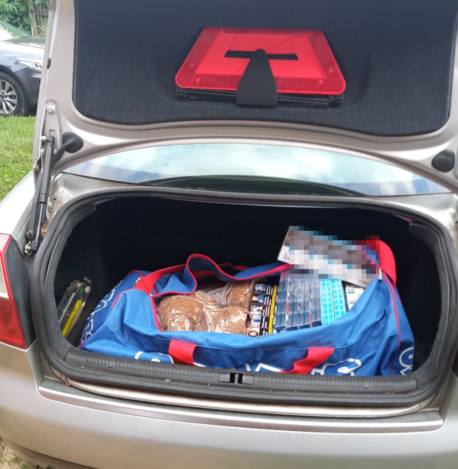 W wyniku przeszukania auta oraz pomieszczenia gospodarczego wykryto 172 kg tytoniu oraz 5252 paczki papierosów nieposiadających polskich znaków akcyzowych o wartości blisko 165 tysięcy złotych.