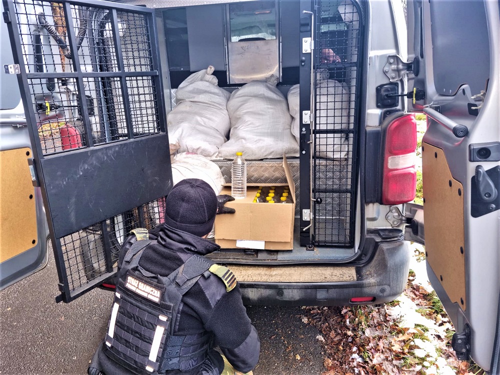 W czwartek 8 grudnia funkcjonariusze z Placówki SG w Jeleniej Górze podczas kontroli zatrzymanego w centrum tego miasta pojazdu, ujawnili w nim ponad 43 kilogramy gotowego tytoniu do palenia oraz 25 litrów alkoholu niewiadomego pochodzenia. Towar należał do właściciela kontrolowanego auta. Tytoń przygotowany był do sprzedaży i zapakowany w półkilogramowe woreczki, natomiast alkohol znajdował się w litrowych butelkach, które nie posiadały żadnych oznaczeń skarbowych akcyzy.