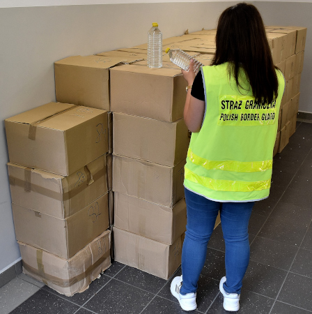 W ostatnią sobotę (8 lipca) jeleniogórscy funkcjonariusze Straży Granicznej uzyskali informację, że na posesji mieszkańca powiatu kłodzkiego mogą znajdować się wyroby akcyzowe bez polskich znaków skarbowych akcyzy. Aby zweryfikować otrzymaną informację funkcjonariusze Straży Granicznej dokonali przeszukania zabudowań znajdujących się na prywatnej posesji obywatela Polski, mieszkańca powiatu kłodzkiego. Okazało się, że interwencja strażników granicznych była niezbędna, ponieważ na terenie posesji w pomieszczeniach gospodarczych znaleziono 84 kartony z wyrobami spirytusowymi bez polskich oznaczeń skarbowych akcyzy. Znalezione wyroby spirytusowe o zawartości 80% alkoholu etylowego, były przechowywane w plastikowych butelkach o pojemności 0,9 litra.