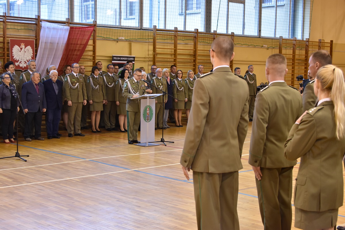 „11 listopada celebrowaliśmy najważniejsze święto państwowe, związane z odzyskaniem przez Polskę po 123 latach jakże upragnionej i wywalczonej niepodległości. To właśnie 105 lat temu nasi przodkowie cieszyli się tą wolnością, a największym ojcem tego sukcesu był bez wątpienia Marszałek Józef Piłsudski. Dzisiaj jesteśmy spadkobiercami tych chlubnych tradycji (…). Z okazji Narodowego Święta Niepodległości będę miał zaszczyt wręczyć funkcjonariuszom odznaczenia państwowe, wyróżnienia i akty mianowań na kolejne stopnie służbowe. Gratuluję Wszystkim i proszę mi uwierzyć, że nie było tutaj przypadkowości. Każdy z Was zasłużył swoją ciężką służbą za co serdecznie dziękuję i proszę o jeszcze” - podkreślił podczas swojego przemówienia Komendant Nadodrzańskiego Oddziału Straży Granicznej gen. bryg. SG Tomasz Michalski.