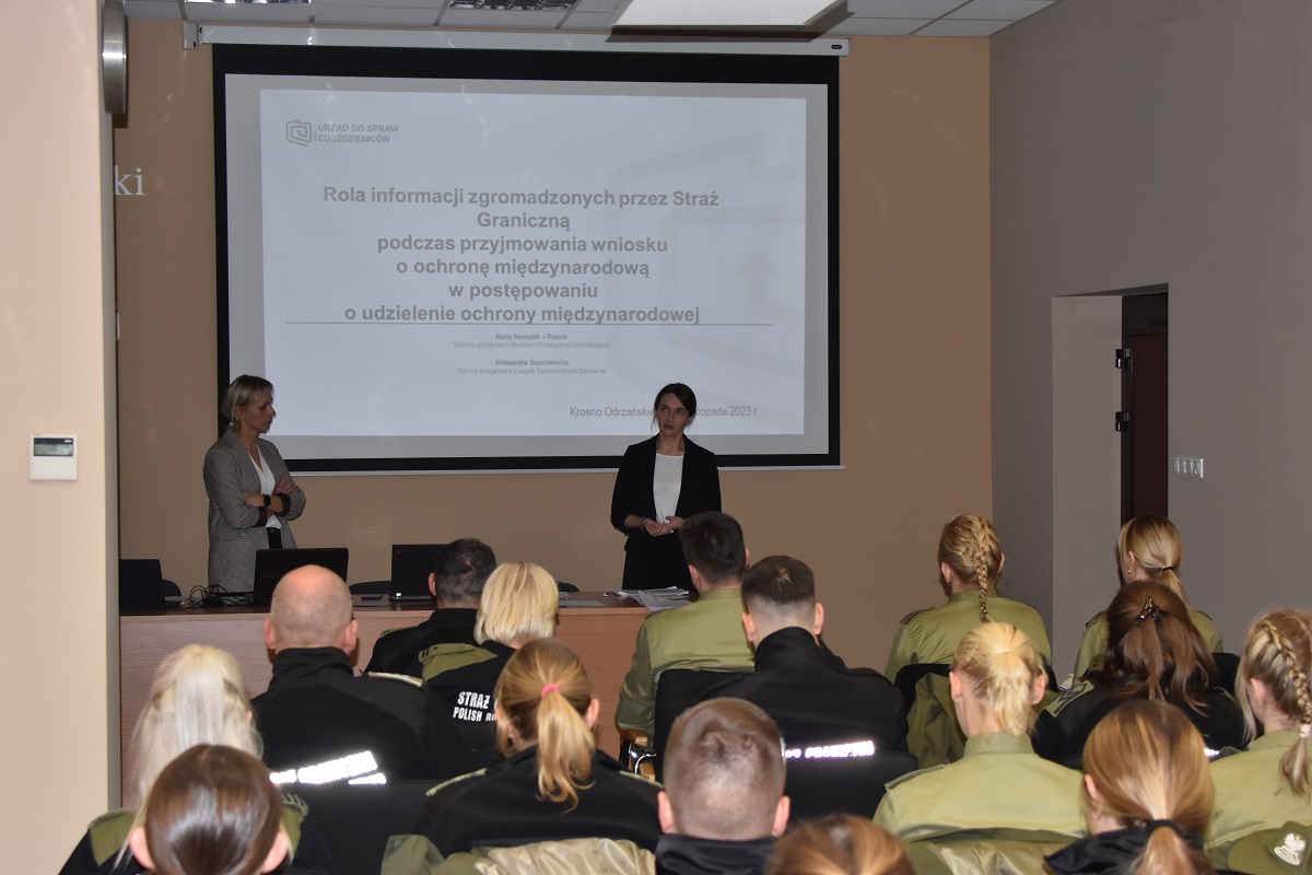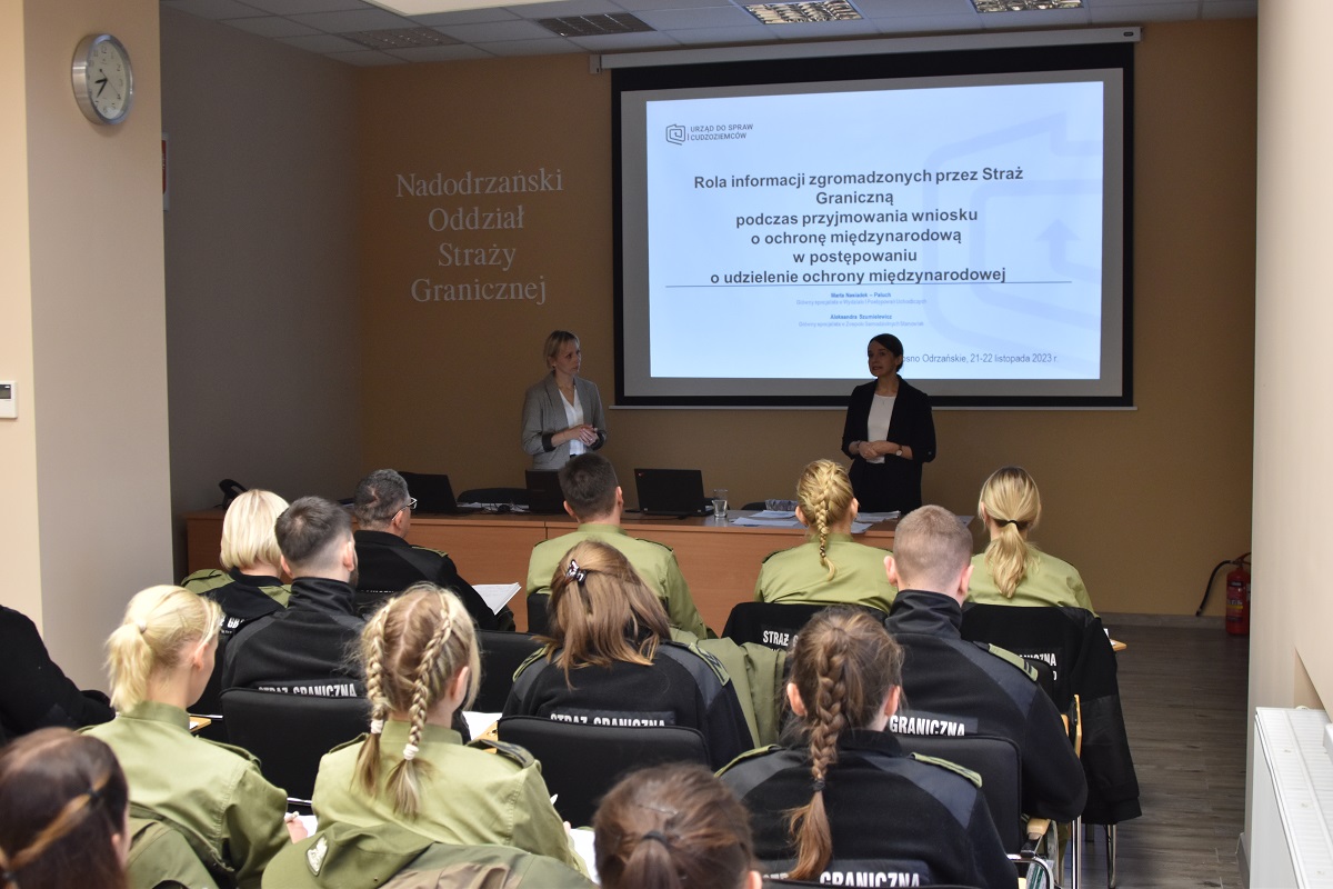 W związku ze zwiększającą się liczbą cudzoziemców wyrażających chęć ubiegania się w Polsce o udzielenie ochrony międzynarodowej, w dniach od 21 do 22 listopada br. w komendzie Nadodrzańskiego Oddziału Straży Granicznej w Krośnie Odrzańskim odbyło się szkolenie dla funkcjonariuszy pionu cudzoziemskiego. Szkolenie pt. Rola informacji zgromadzonych przez Straż Graniczną podczas przyjmowania wniosku o ochronę międzynarodową w postępowaniu o udzielenie ochrony międzynarodowej, w ramach cyklu wspólnych spotkań przeprowadzili pracownicy z Departamentu Postępowań Uchodźczych Urzędu do Spraw Cudzoziemców w Warszawie Pani Aleksandra Szumielewicz – Główny Specjalista Zespołu Samodzielnych Stanowisk oraz Pani Marta Nasiadek-Paluch – Główny Specjalista Wydziału I Postępowań Uchodźczych.