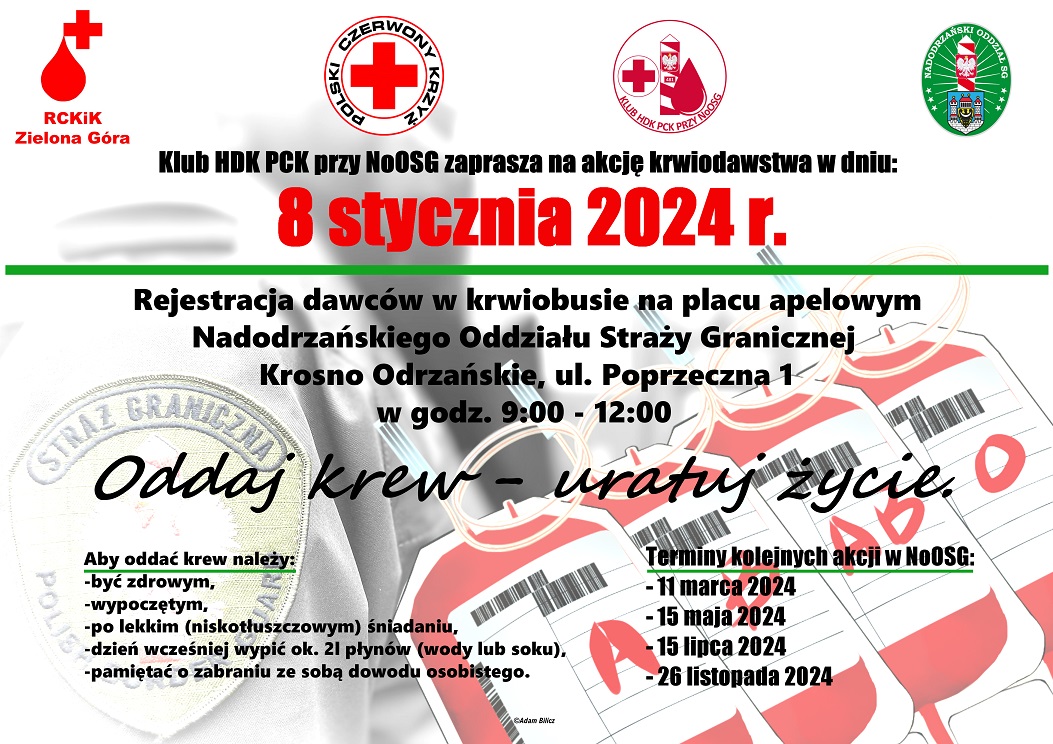 Klub Honorowych Dawców Krwi PCK przy NoOSG zaprasza do udziału w akcji krwiodawstwa, która odbędzie się po raz pierwszy w nowym 2024 roku, już w poniedziałek 8 stycznia w Komendzie Nadodrzańskiego Oddziału Straży Granicznej w Krośnie Odrzańskim w godzinach 9:00 - 12:00.