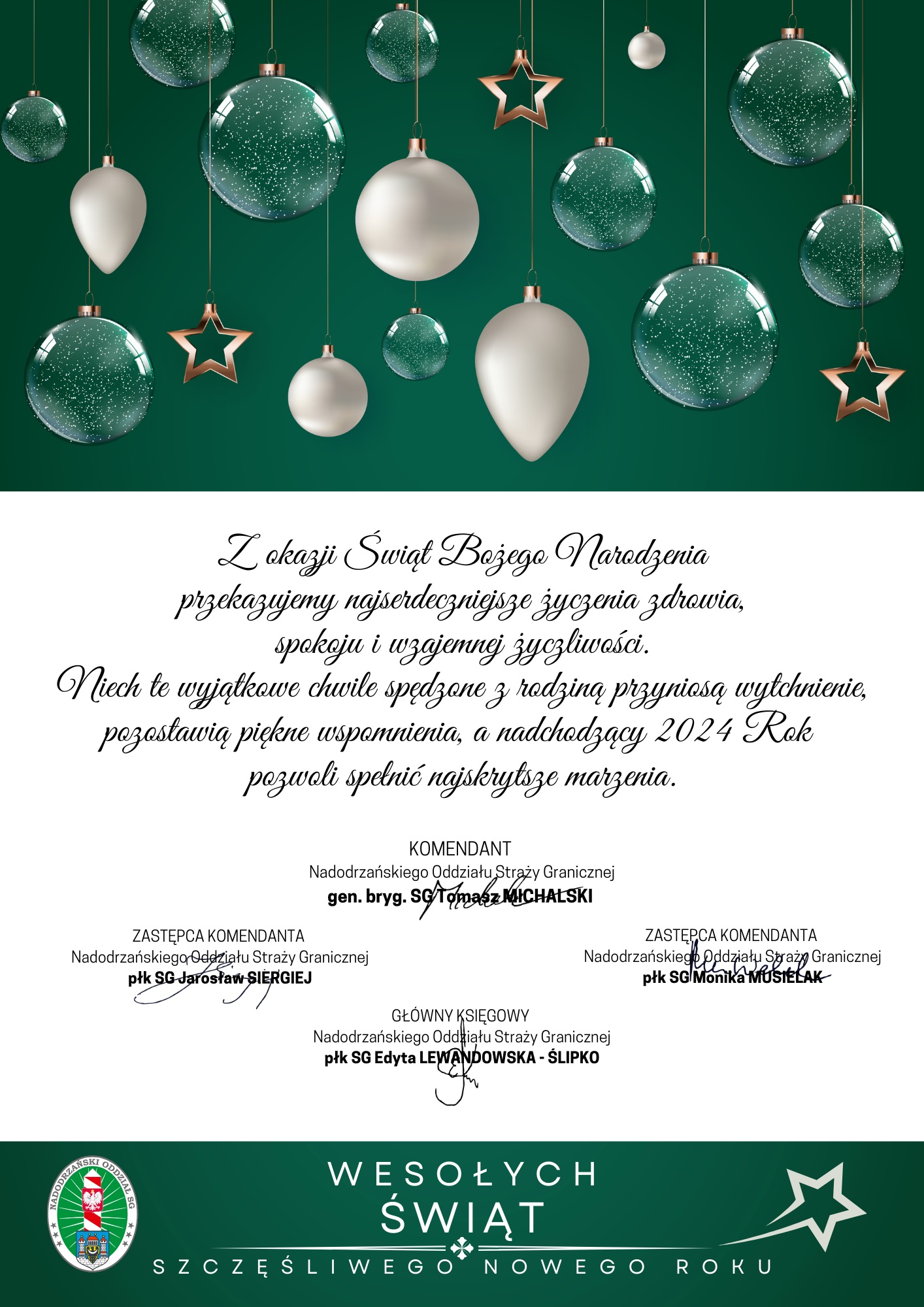 Życzenia z okazji Świąt Bożego Narodzenia i Nowego Roku od kierownictwa Nadodrzańskiego Oddziału Straży Granicznej.