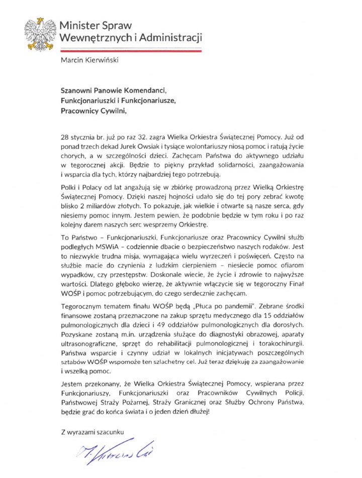 Minister Marcin Kierwiński skierował do funkcjonariuszy i pracowników poszczególnych służb podległych MSWiA list zachęcający do udziału w 32. finale Wielkiej Orkiestry Świątecznej Pomocy. Chcemy, aby funkcjonariuszki, funkcjonariusze oraz pracownicy Policji, Państwowej Straży Pożarnej, Straży Granicznej oraz Służby Ochrony Państwa zaangażowali się w tę piękną i szlachetną inicjatywę.