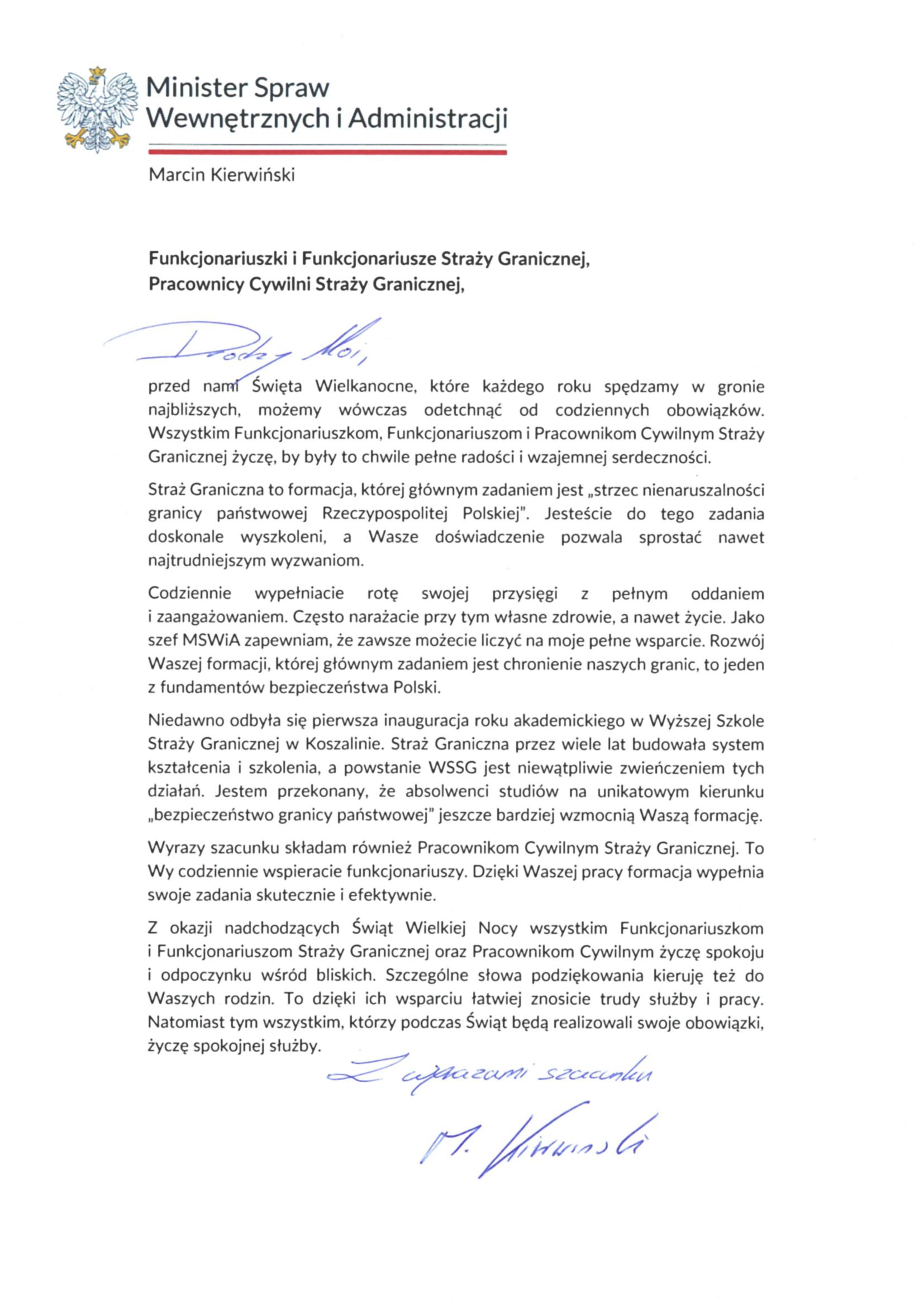 Minister Spraw Wewnętrznych i Administracji Marcin Kierwiński z okazji Świąt Wielkanocnych przesłał list z życzeniami dla funkcjonariuszy i pracowników Straży Granicznej.