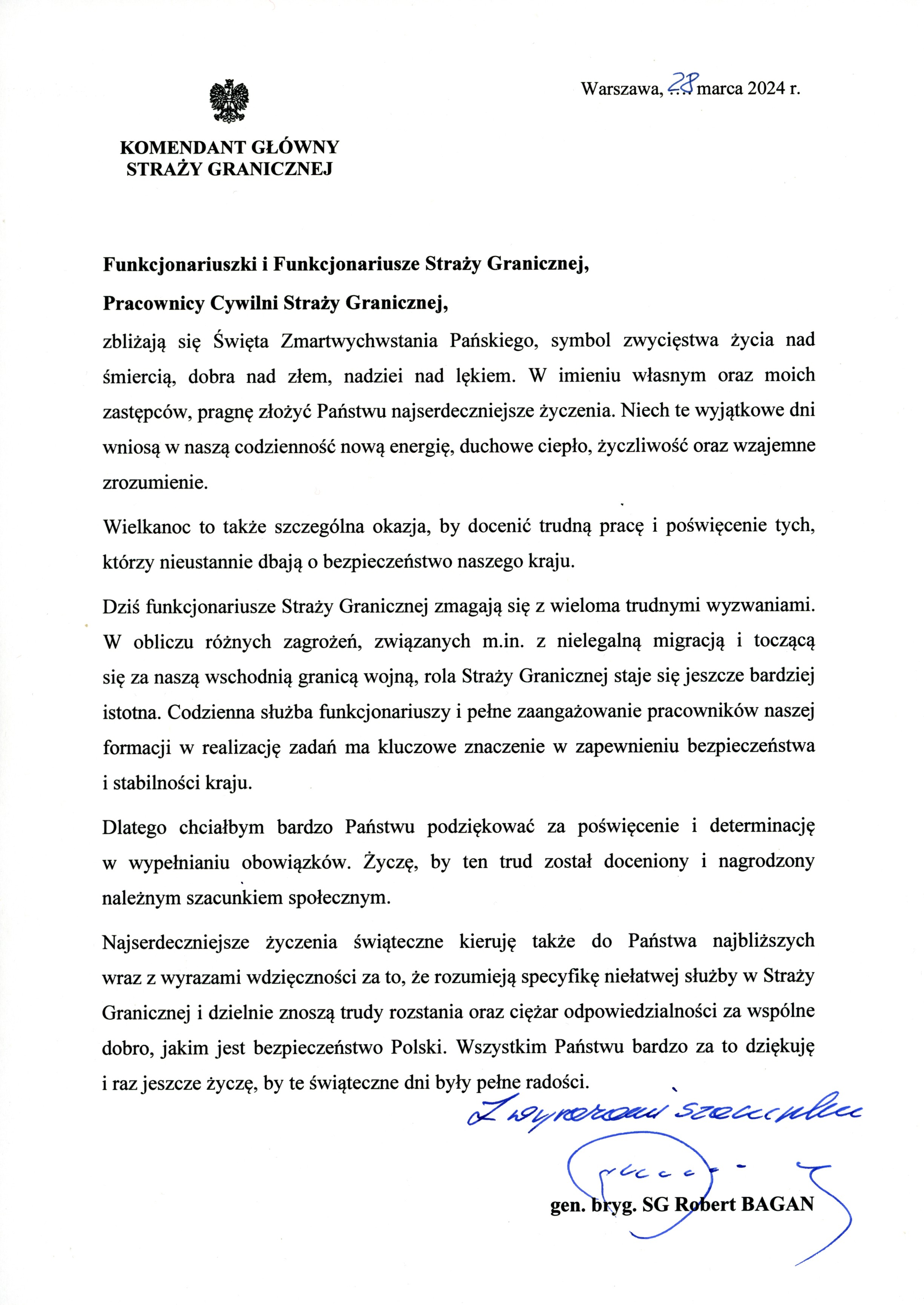 Życzenia wielkanocne Komendanta Głównego Straży Granicznej