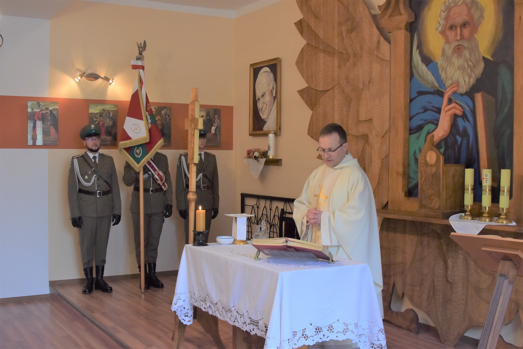 Uroczyste obchody 33. rocznicy utworzenia Straży Granicznej oraz 15. rocznicy powstania Nadodrzańskiego Oddziału Straży Granicznej rozpoczęły się 23 maja w kaplicy komendy oddziału mszą świętą w intencji funkcjonariuszy i pracowników Straży Granicznej. Nabożeństwo w asyście kapelana Wojsk Obrony Terytorialnej ks. por. Marcina Majewskiego odprawił kapelan NoOSG ks. por. Piotr Marciniak, który wygłosił okolicznościowe kazanie, skierowane do funkcjonariuszy i pracowników naszego oddziału z przesłaniem, abyśmy wypełniali w dalszym ciągu na jak najwyższym poziomie zadania jakie stoją przed Strażą Graniczną mając na względzie dobro naszej Ojczyzny.