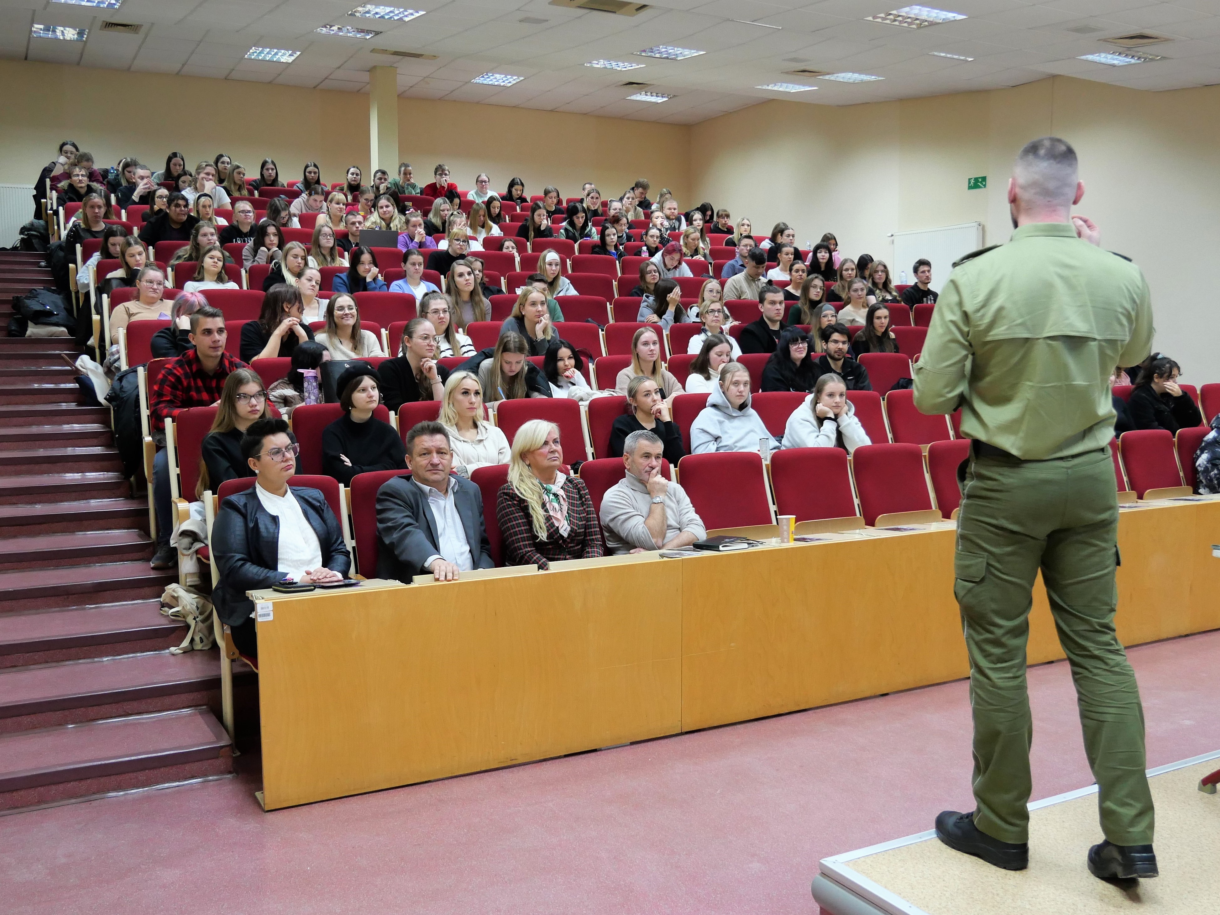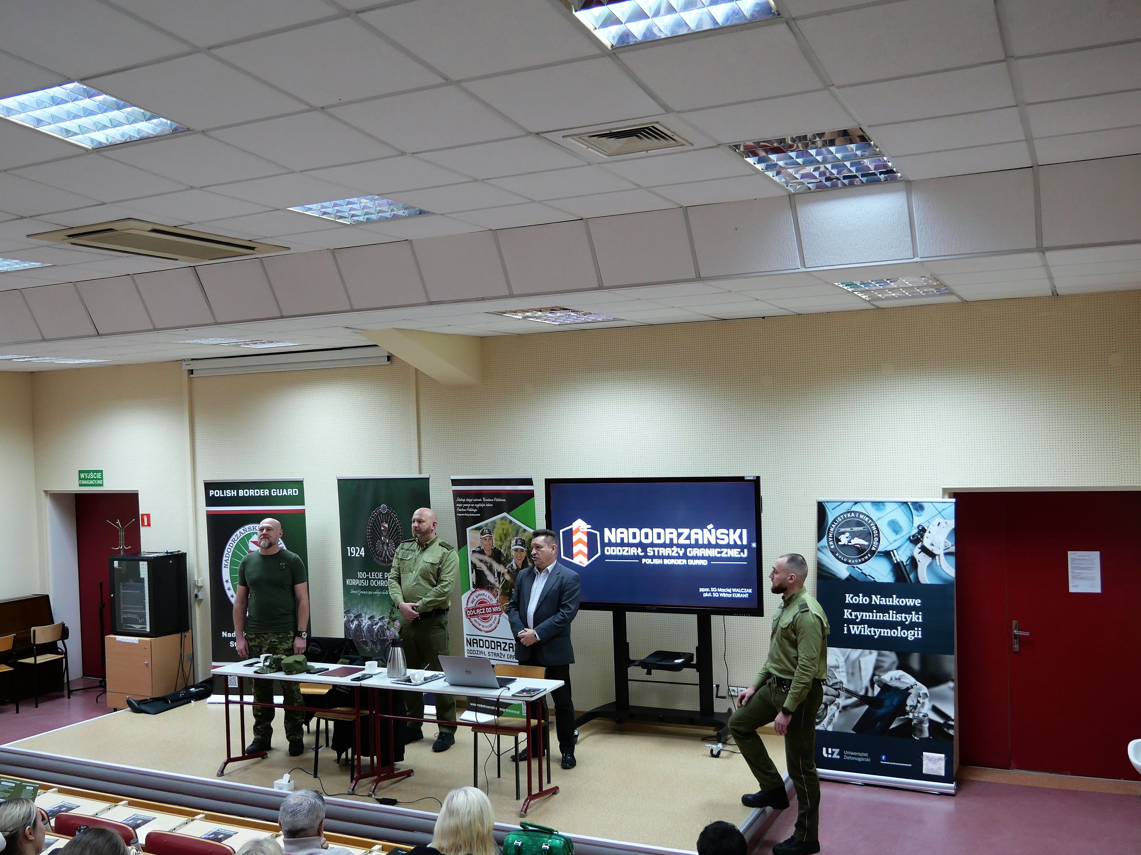 19 listopada w auli Uniwersytetu Zielonogórskiego funkcjonariusze komendy Nadodrzańskiego Oddziału Straży Granicznej opowiadali studentom o służbie w naszej formacji. Na spotkanie licznie przybyli studenci Resocjalizacji i Kryminologii UZ oraz członkowie Koła Naukowego Kryminalistyki i Wiktymologii. Wraz ze studentami w spotkaniu uczestniczyli pracownicy naukowi z Zakładu Resocjalizacji Uniwersytetu Zielonogórskiego: prof. Barbara Toroń- Fórmanek, dr Monika Kaczmarczyk, dr Ernest Magda oraz dr Andrzej Zygadło. Wtorkowa wizyta funkcjonariuszy SG w zielonogórskiej uczelni zainaugurowała planowany cykl spotkań ze studentami, zainteresowanymi różnymi aspektami służby w Nadodrzańskim Oddziale Straży Granicznej.