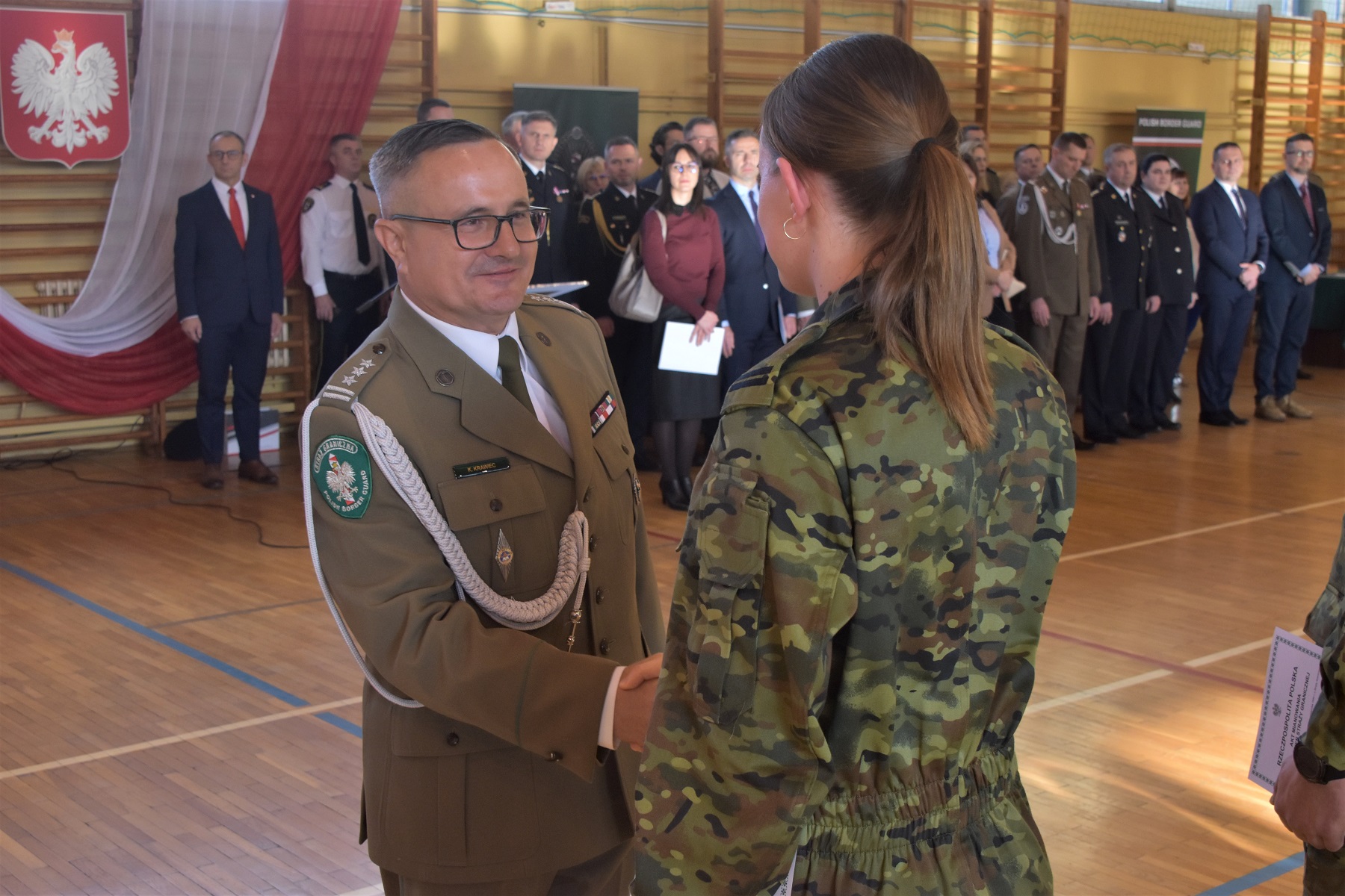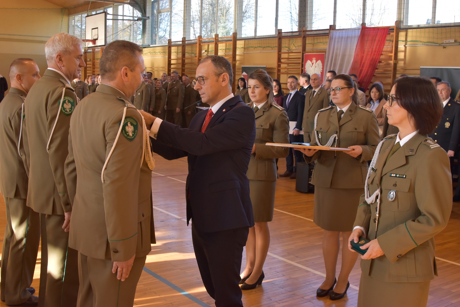 „Tegoroczna, sto szósta już rocznica odzyskania przez Polskę niepodległości to doskonały czas ku refleksji nad chlubnymi kartami polskiej historii i ideą wolności, sposobność do zaprezentowania naszej jedności, dumy i tożsamości narodowej, wyrażenia wdzięczności dla poświęceń minionych pokoleń oraz poszanowania dla ojczystych wartości (…) Jest mi niezwykle miło zauważyć, że pomimo zachodzących w formacji zmian oraz stawianych przed nami nowych, wymagających wyzwań, merytoryczna działalność Nadodrzańskiego Oddziału Straży Granicznej oceniana jest bardzo wysoko, a osiągane wyniki plasują nas w ścisłej czołówce w skali całego kraju. Dziękuję za Waszą sumienność, rzetelność, ponadprzeciętne zaangażowanie w wykonywanie obowiązków służbowych, za Waszą gotowość, wolę i determinację do mierzenia się z codziennymi wyzwaniami, za to, że bez względu na okoliczności pozostajecie gwarantem rzetelności i najwyższego profesjonalizmu. Pamiętajcie, że to Wy stanowicie filar tego oddziału i każdy z Was, niezależnie od zajmowanego przez siebie stanowiska, dokłada przysłowiową cegiełkę do budowania jego sukcesów. Bądźcie z tego dumni.” - podkreśliła podczas swojego przemówienia płk SG Monika Musielak Komendant Nadodrzańskiego Oddziału Straży Granicznej.