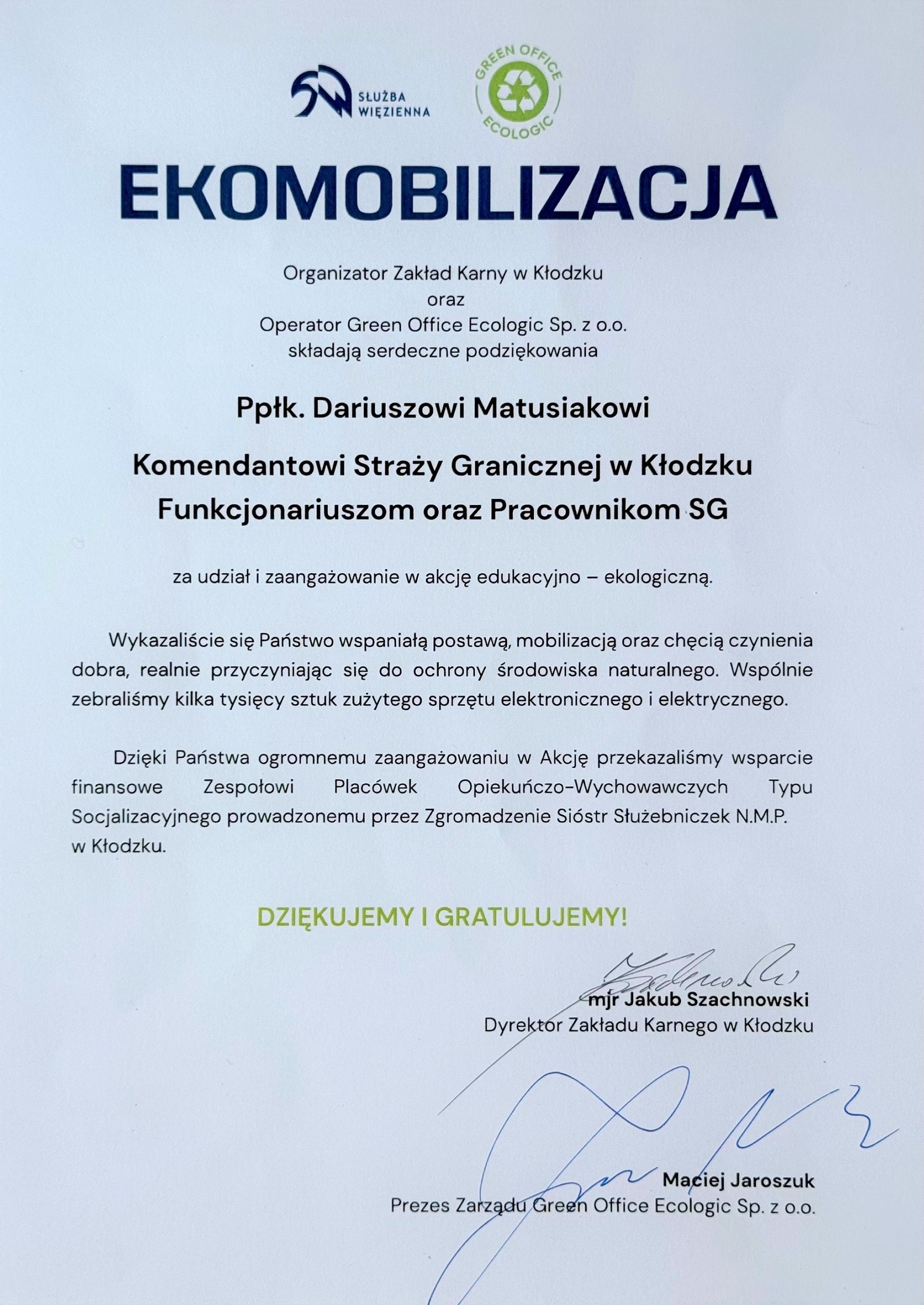 Tuż przez świętami na ręce Komendanta Placówki SG w Kłodzku ppłk. SG Dariusza Matusiaka wpłynęły podziękowania dla wszystkich funkcjonariuszy i pracowników placówki. Dyrektor Centrum Integracji Społecznej Gminy Kłodzko Pani Danuta Kołt podziękowała za pomoc, wparcie i ogromne zaangażowanie w prowadzeniu Punku Darów dla powodzian, zorganizowanego we wrześniu zaraz po przejściu wielkiej wody. Z kolei Dyrektor Zakładu Karnego w Kłodzku mjr Jakub Szachnowski podziękował za udział i wsparcie akcji edukacyjno-ekologicznej, podczas której zbierano zużyty sprzęt elektroniczny i elektryczny, a środki otrzymane ze sprzedaży elektrośmieci w całości przekazano do Zespołu Placówek Opiekuńczo-Wychowawczych prowadzonego przez Zgromadzenie Sióstr Służebniczek N.M.P. w Kłodzku.