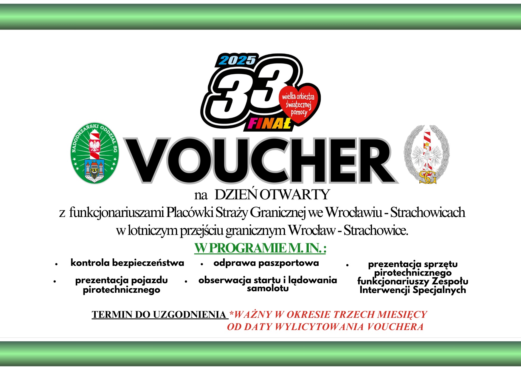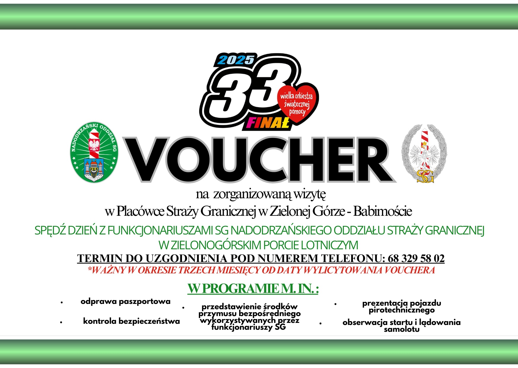 Liczymy, że tak jak poprzedniego roku, z dużym zainteresowaniem spotka się możliwość odwiedzenia naszych placówek Straży Granicznej, m.in. wygrania licytacji vouchrów upoważniających zwycięzców do odwiedzenia lotniczego przejścia granicznego w Placówce SG we Wrocławiu-Strachowicach, obejrzenia prezentacji sprzętu pirotechnicznego wrocławskich funkcjonariuszy z Zespołu Interwencji Specjalnych SG lub wygrania vouchera upoważniającego do spędzenia dnia z funkcjonariuszami Nadodrzańskiego Oddziału SG w zielonogórskim porcie lotniczym.