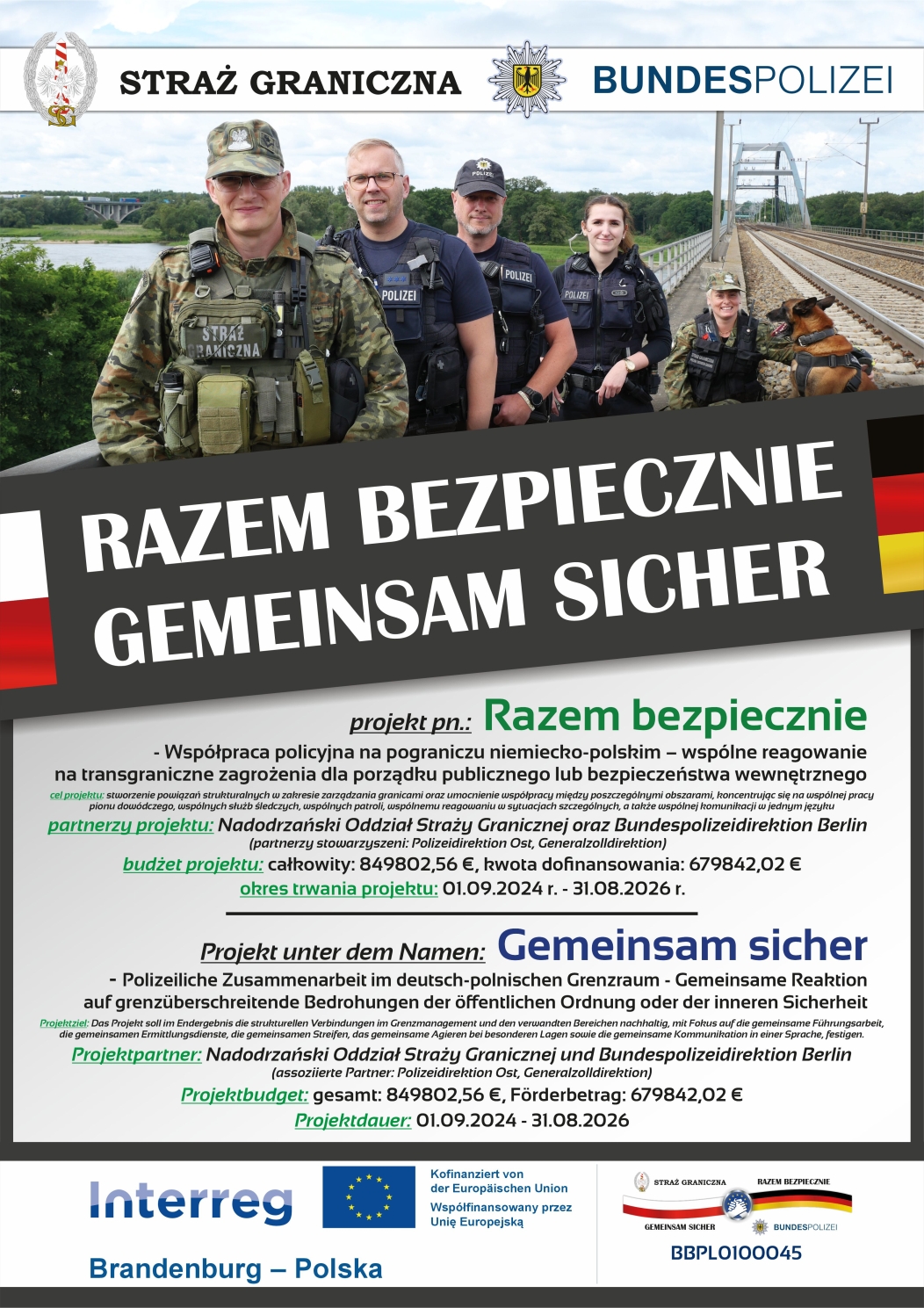 Wydarzenie będzie realizowane także dzięki środkom z projektu: Razem bezpiecznie - Współpraca policyjna na pograniczu niemiecko-polskim - wspólne reagowanie na transgraniczne zagrożenia dla porządku publicznego lub bezpieczeństwa wewnętrznego - współfinansowany przez Unię Europejską ze środków Europejskiego Funduszu Rozwoju Regionalnego w ramach Programu Współpracy INTERREG VI A Brandenburgia-Polska 2021 - 2027.