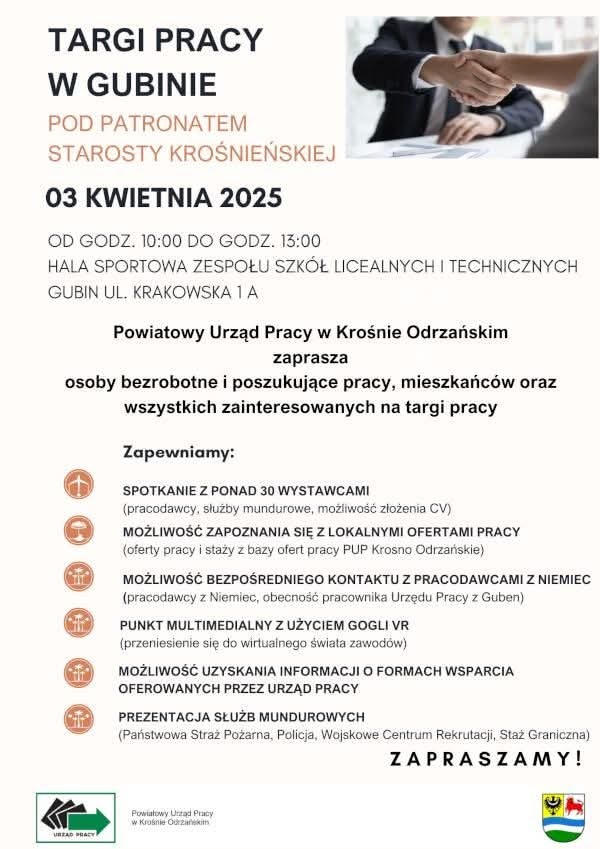 Targi pracy organizowane przez Powiatowy Urząd Pracy w Krośnie Odrzańskim odbyły się 3 kwietnia w hali Zespołu Szkół Licealnych i Technicznych w Gubinie. Była to druga edycja wydarzenia która zgromadziła około 30 wystawców, z różnych instytucji, firm i służb mundurowych. Na targach nie zabrakło Nadodrzańskiego Oddziału Straży Granicznej, który reprezentowali funkcjonariusze z Placówki SG w Zielonej Górze-Babimoście.