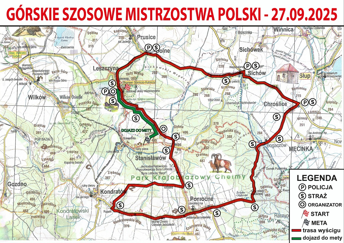 Pod honorowym patronatem Wójta Gminy Złotoryja 27 września w urokliwej miejscowości Leszczyna (dolnośląskie) odbyły się Górskie Mistrzostwa Polski tandemów, służb mundurowych oraz amatorów w kolarstwie szosowym. W imprezie Nadodrzański Oddział Straży Granicznej reprezentowali: mjr SG Maciej Szafratowicz funkcjonariusz komendy oddziału oraz mł. chor. SG Karolina Cedro z Placówki SG w Gorzowie Wlkp. Mistrzostwa rozgrywane były na trzech dystansach: jedna pętla to 34 km, dwie pętle - 64 km oraz trzy pętle - 94 km. Uczestnicy amatorzy klasyfikowani byli w kategoriach wiekowych, a zawodników ze służb mundurowych dodatkowo podzielono na formacje. W rywalizacji wzięło udział 120 zawodników i zawodniczek amatorów oraz reprezentantów służb mundurowych m.in. policji, Wojska Polskiego, Straży Granicznej, Państwowej Straży Pożarnej oraz Straży Leśnej. Trasa wiodła przez Park Krajobrazowy Chełmy usytuowany niedaleko Złotoryi, gdzie zawodnicy mogli odczuć typowo górski charakter wyznaczonej trasy - długie podjazdy i niebezpieczne kręte zjazdy.