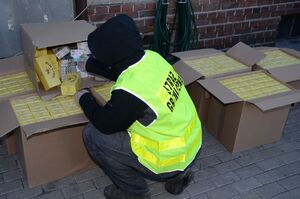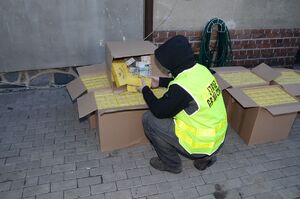 Dodatkowo w m. Dzierżoniów dokonano przeszukania lokalu mieszkalnego kolejnego z pasażerów kontrolowanego wcześniej pojazdu. Na miejscu ujawniono ok. 30 kg krajanki tytoniowej, 250 pudełek z zawartością po 200 sztuk papierosów bez znaków akcyzy, do posiadania których przyznał się jeden z pasażerów kontrolowanego samochodu.