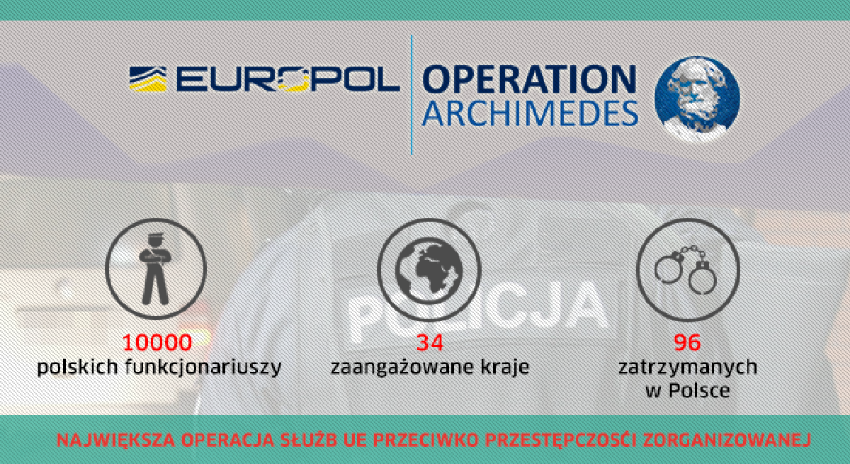Ponad 10 tys. polskich policjantów, strażników granicznych i celników wzięło udział w operacji „Archimedes” - największej do tej pory skoordynowanej operacji służb UE przeciwko przestępczości zorganizowanej. W operacji koordynowanej przez Europol uczestniczyły organy ścigania z 34 krajów. Za działania polskich służb odpowiedzialne było MSW.