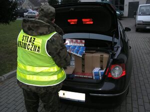 Funkcjonariusze z placówki w Tuplicach podczas wykonywania zadań w powiecie żagańskim, skontrolowali osobowego volkswagena. Zarówno w bagażniku, jak i wewnątrz pojazdu, znajdowały się kartony z papierosami bez polskiej akcyzy – prawie 130 tysięcy sztuk papierosów. Ich rynkową wartość oszacowano na 76,5 tysiąca zł.