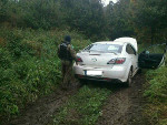 Mazdę 6 wartą 60 000 zł postanowiono wywieźć z Niemiec polnymi drogami..Funkcjonariusze Straży Granicznej kontrolujący znaki graniczne wpadli na jej ślad. Przy próbie ucieczki samochód ugrzązł w błocie.