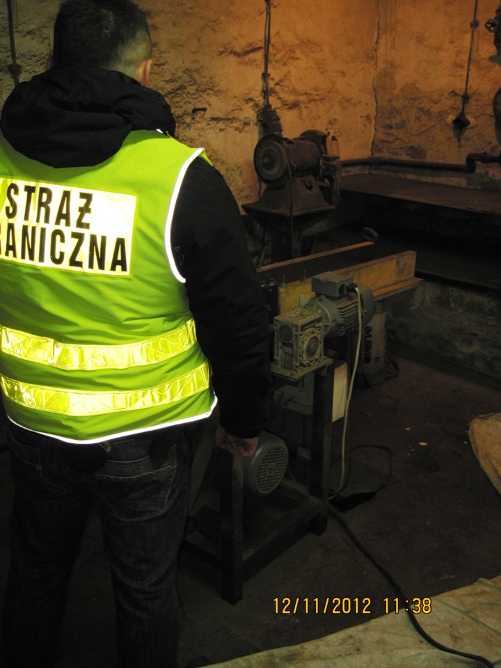 Funkcjonariusze Straży Granicznej z Placówki w Szczecinie wraz z funkcjonariuszami Izby Celnej ujawnili 6 balotów liści tytoniu w trakcie kontroli jednego z samochodów ciężarowych prowadzonej w Szczecinie. Idąc tym tropem sprawdzili posesję, na którą wjeżdżał. Ich przypuszczenia się potwierdziły. W jednym z pomieszczeń gospodarczych ujawnili maszynę do krojenia tytoniu oraz krajankę tytoniu. Łącznie ujawniliśmy 7 kilogramów krajanki tytoniu bez polskich znaków akcyzy skarbowej oraz prawie 300 kilogramów liści tytoniu przeznaczonych do cięcia. Łączna wartość nielegalnego towaru to około 10 000 zł. Towar wraz z maszyną zgodnie z właściwością zabezpieczyli funkcjonariusze Izby Celnej ze Szczecina.