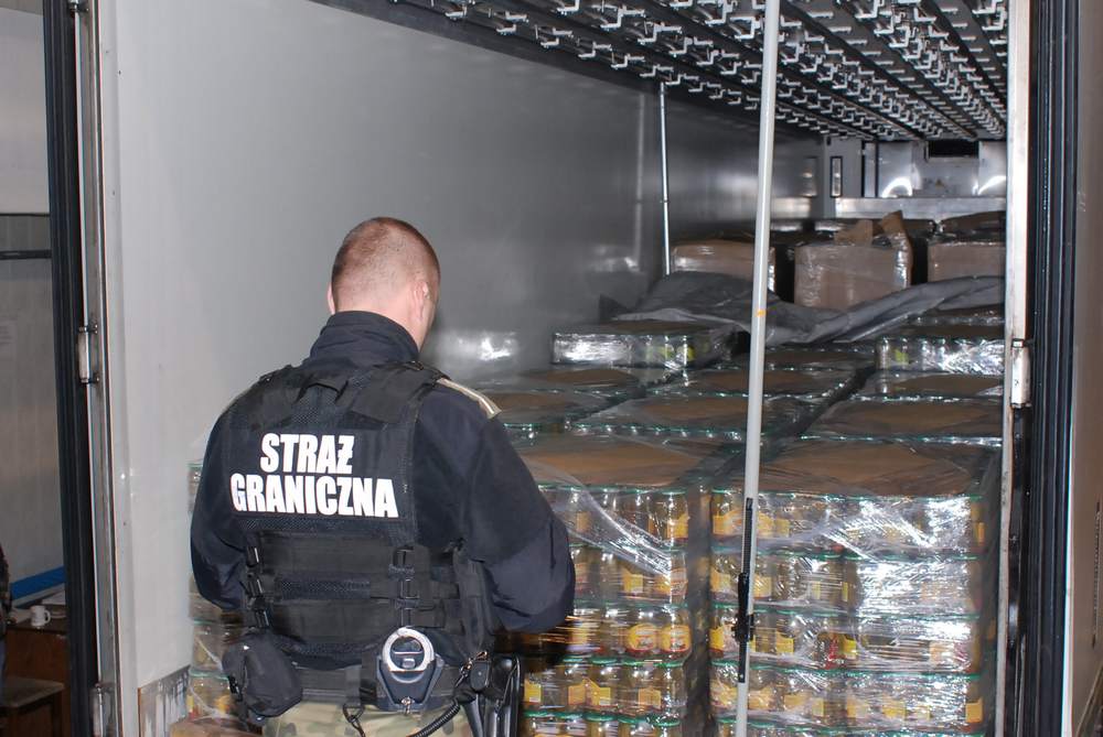 Funkcjonariusze Nadodrzańskiego Oddziału Straży Granicznej wytypowali do kontroli samochód ciężarowy, który zmierzał w kierunku Niemiec w okolicach Świecka. W wyniku prowadzonej kontroli ustaliliśmy, że deklarowany w dokumentach towar to przetwory warzywne. Po otwarciu naczepy okazało się, że pomiędzy paletami ze słoikami ogórków zmieściło się dodatkowo ponad 16 000 sztang papierosów bez polskich znaków akcyzy skarbowej (to ponad 3,3 mln sztuk). Otwarcia i przeliczenia towaru dokonaliśmy z Służbą Celną z Rzepina. Wartość ujawnionego towaru szacujemy na 1,5 miliona złotych. Kierowca został zatrzymany do wyjaśnienia, do tego czasu pozostaje do dyspozycji Straży Granicznej.