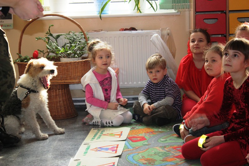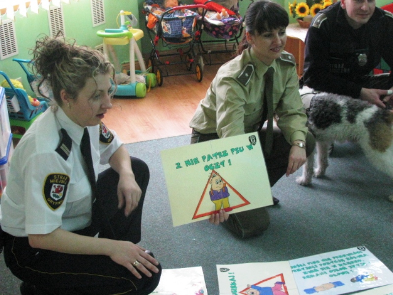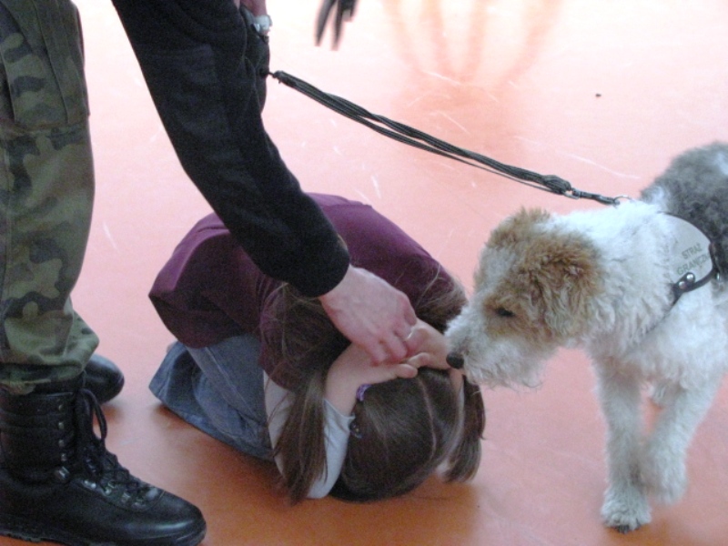 Każdorazowo pierwsza część zajęć miała charakter pogadanki, podczas której wykorzystywano plansze poglądowe przy omawianych podstawowych zasadach postępowania w kontakcie z obcymi psami. Omawiano zachowania oraz przyczyny, które mogą prowokować psa do ataku. Następnie w części praktycznej spotkania zaprezentowane i omawiane były sposoby obrony przed atakiem psa, tj. pozycja ,,żółwia” i ,,drzewko”. Uczniowie z dużą uwagą i zaangażowaniem uczestniczyli w zajęciach, brali czynny udział w dyskusji, zadawały dużo dociekliwych pytań.
