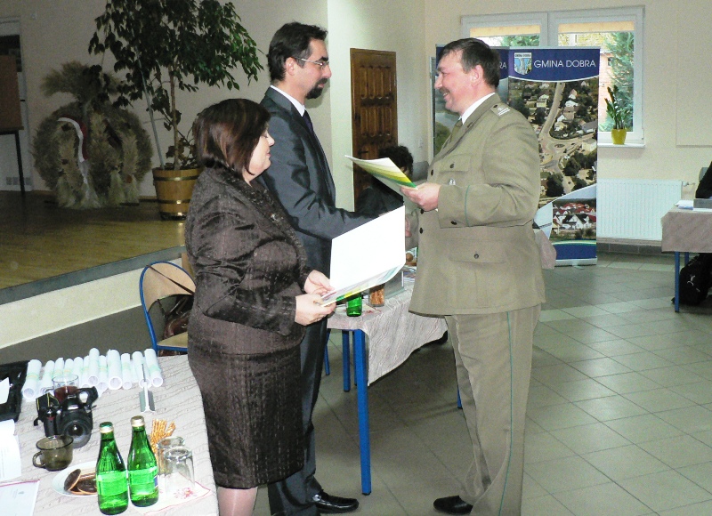 Na pamiątkę dobrej współpracy w Dobrej, Komendant Placówki SG wręczył Pani Wójt Teresie Dera i Przewodniczącemu Rady Gminy Panu Bartłomiejowi Miluchowi pamiątkowe podziękowania.