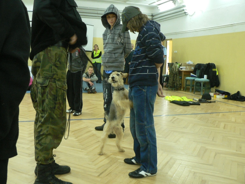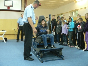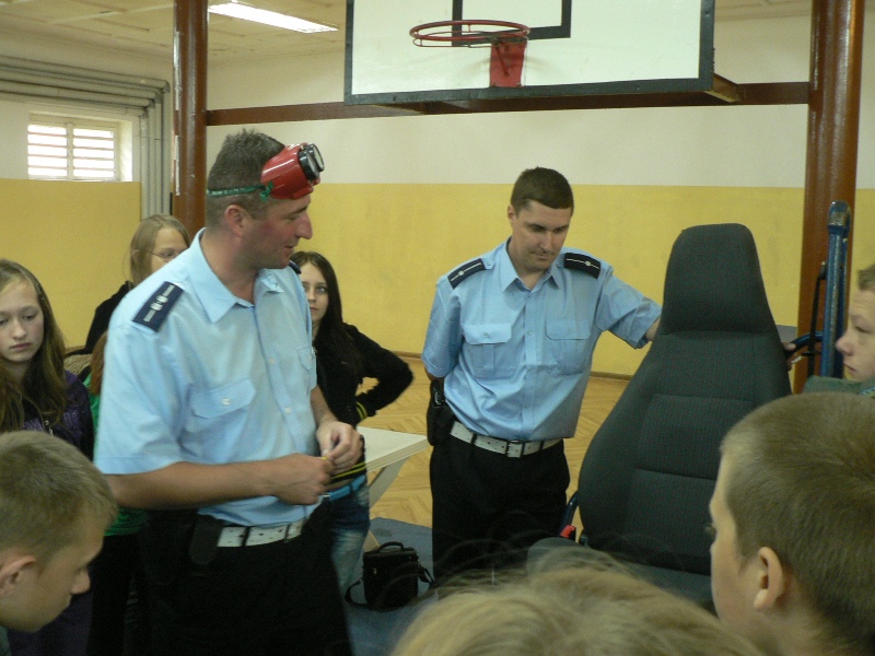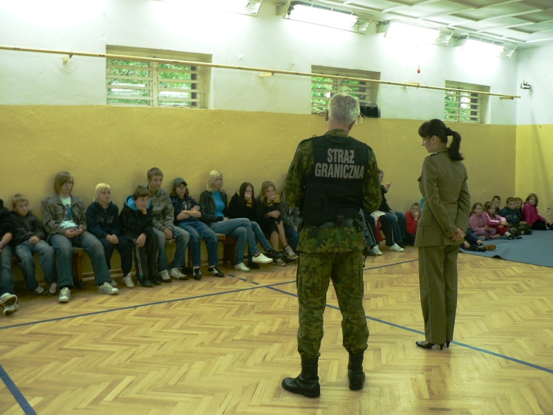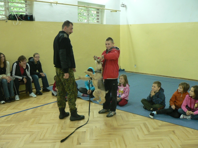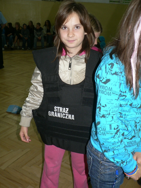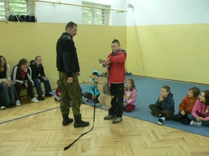 Spotkanie z psem służbowym SG "ARI" było okazją do zwrócenia uwagi na szkodliwość substancji odurzających. Oczywiście nie zabrakło przypomnienia i utrwalenia postaw obronnych "żółwika" i "drzewka", które warto stosować w sytuacjach zagrożenia ze strony psa. Ciekawym spostrzeżeniem dla funkcjonariuszy i dzieci było stwierdzenie, że teraz po reorganizacji "jesteśmy w jednym oddziale". Mieszkańcy Bogatyni znają służbę Straży Granicznej, tym łatwiej było się nam porozumieć. Policjanci z wydziału ruchu drogowego przywieźli ze sobą symulator zderzeń pozwalający przekonać się skuteczności pasów bezpieczeństwa. Dużą atrakcja pobudzająca wyobraźnię był spacer w alkogoglach – imitujących widzenie po spożyciu ok. 1 - 1,5 promila alkoholu.