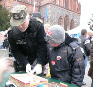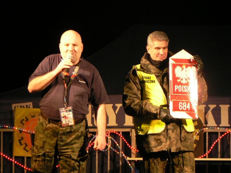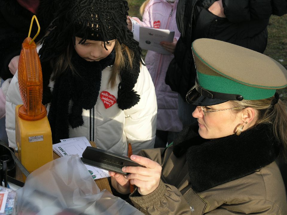 Na licytację wystawiono ciekawe pamiątki związane ze Strażą Graniczną: autentyczne orzełki i numery dwóch słupów granicznych, pamiątkowe grawertony z uroczystości wręczenia sztandaru Oddziałowi, jednodniowe szkolenie z pododdziałem antyterrorystycznym w Krośnie Odrzańskim oraz album z pojazdami Policji Federalnej Niemiec. Łącznie konto Orkiestry wzbogaciło się o 1570 zł. Dodatkową niepoliczoną kwotą są pieniądze zbierane przy naszych stoiskach przez wolontariuszy Orkiestry. Dziękujemy !!!!!