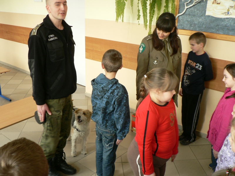 w przyjmowaniu postaw obronnych, przedstawienie cech agresywnego psa zainteresowały bardzo uczniów i wychowawców. Zdobyte umiejętności weryfikował na bieżąco pies służbowy, który w nagrodę za cierpliwość prezentował elementy tresury oraz zamiłowania ekwilibrystyczne wzbudzając radość i podziw wśród dzieciaków i dorosłych.
