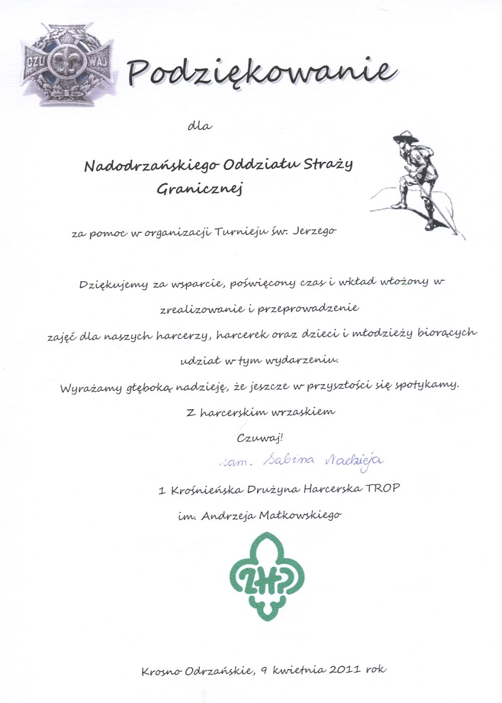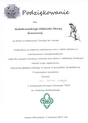 9 kwietnia 2011 roku 1 Krośnieńska Drużyna Harcerska TROP im. Andrzeja Małkowskiego odwiedziła nasz Oddział. Harcerze mieli okazję zapoznać się z historią naszej formacji zwiedzając Salę Tradycji, oglądali eksponaty, które mogli dotknąć i przymierzyć. Świetnie się przy tym bawili i zadawali mnóstwo pytań. Ślad miłej atmosfery odciśnięty został w postaci wpisu do Kroniki. Na placu w Komendzie Oddziału funkcjonariusze z Placówki w Zielonej Górze-Babimoście zorganizowali prezentację sprzętu i psa służbowego. Harcerze obiecali, że jeszcze tu wrócą.