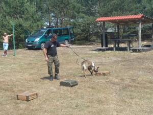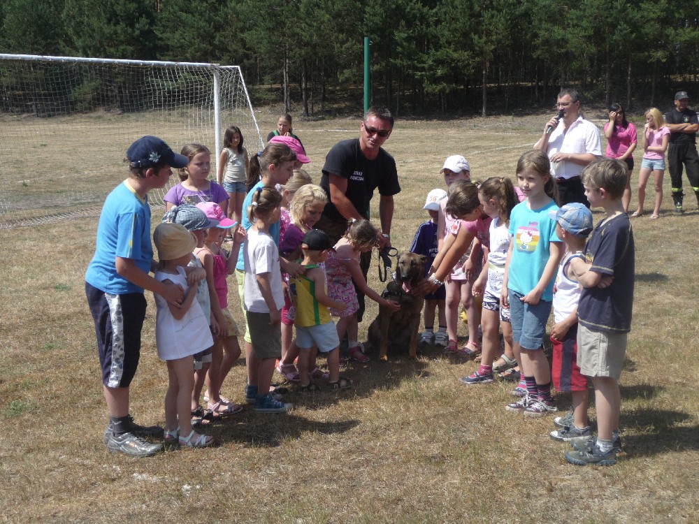 Owczarek belgijski zaprezentował swoje wyszkolenie w bezbłędnym wyszukiwaniu ukrytych papierosów. Dzieci miały okazję dowiedzieć się jak należy postępować w przypadku spotkania agresywnego lub nieznanego psa. Przećwiczyły postawy obronne „żółwika” i „drzewko”. Przewodnik psa poruszył również temat odpowiedniego, godnego traktowania i opiekowania się przez dzieci i dorosłych naszych czworonożnych pupili. Za swój pokaz pies otrzymał wielkie brawa i porcję ….. gorącego głaskania.