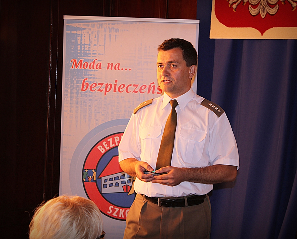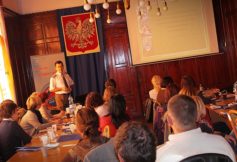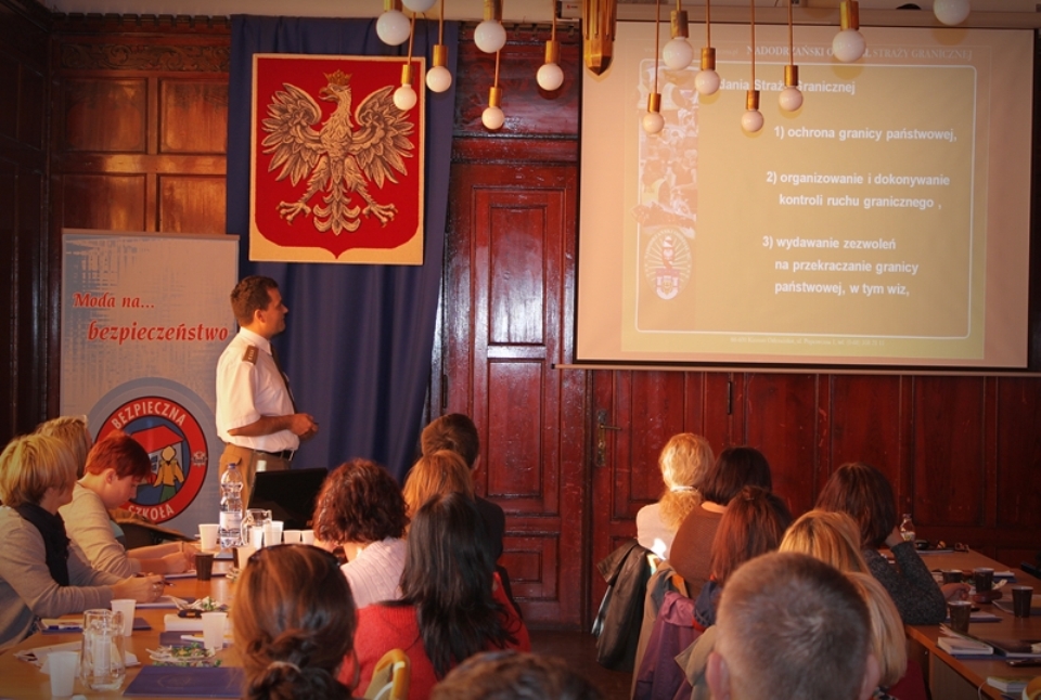 Program od ośmiu lat wdrażany jest przez funkcjonariuszy KWP w Szczecinie i ma na celu inicjowanie działań o charakterze profilaktycznym na terenie placówek oświatowych |w Województwie Zachodniopomorskim. Studium promujące bezpieczeństwo wśród dzieci i młodzieży trwa cały rok szkolny 2011/2012 i umożliwia raz w miesiącu przekazanie uczestnikom spotkań informacji niezbędnych szkołom w przypadku zagrożenia bezpieczeństwa na jej terenie. W spotkaniu wzięli udział pełnomocnicy do spraw bezpieczeństwa z placówek oświatowych zgłoszonych do programu ,,Bezpieczna Szkoła”. Przedstawiciele z poszczególnych służb mundurowych, min.: Policji, Państwowej Straży Pożarnej, Straży Miejskiej w trakcie październikowego spotkania omówili swoje uprawnienia, obowiązki oraz możliwości współpracy z placówkami oświatowymi. Charakterystykę formacji, specyfikę oraz zadania Straży Granicznej przybliżył słuchaczom zastępca Komendanta PSG w Szczecinie Pan kpt. SG Zbigniew Pałka. Przedstawił również możliwości współpracy szkół ze Strażą Graniczą w zakresie profilaktyki i edukacji w obszarze bezpieczeństwa.zdjęcia: KWP w Szczecinie