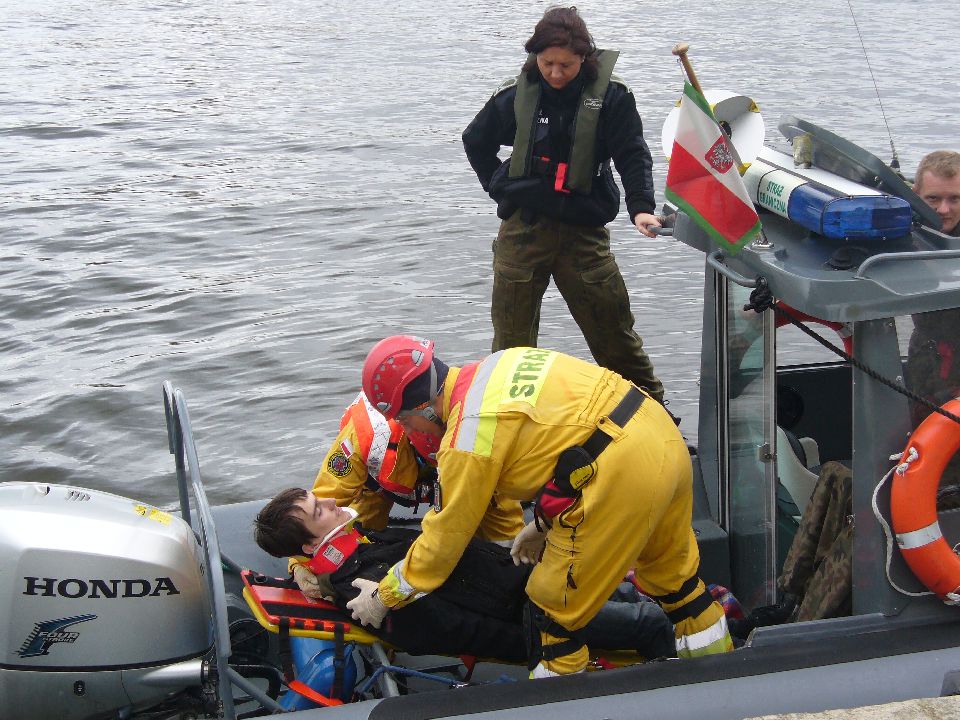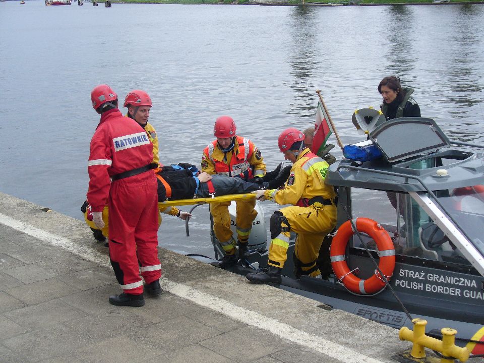 Na statku wybucha panika i podczas ewakuacji na tratwy ratunkowe 10 pasażerów wskakuje do wody. Jako pierwsze na miejsce przybywają jednostki WOPR i rozpoczynają podejmowanie osób znajdujących się w wodzie. W międzyczasie jednostka Urzędu Morskiego w Szczecinie oraz Straży Granicznej zabezpiecza miejsce zdarzenia - zamknięcie toru wodnego. Od strony lądu przybywają: Straż Pożarna, samochód WOPR, Pogotowie Ratunkowe, Policja i pozostałe służby. Koordynator PSP podejmuje decyzję o rozmieszczeniu sił i środków.