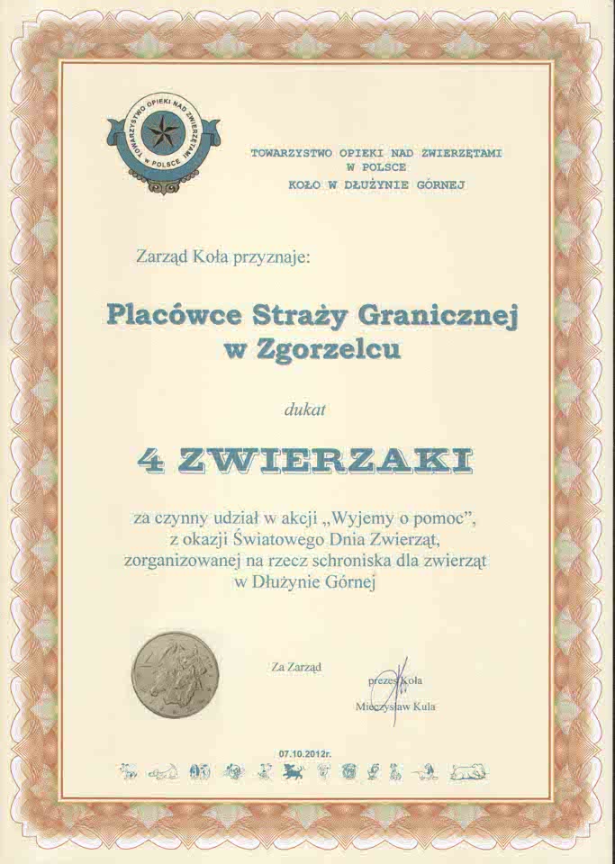 7 października 2012r. w CHR Plaza Zgorzelec odbyła się impreza charytatywna "Wyjemy o pomoc", w której brali udział przewodnicy z psami służbowymi z PSG w Zgorzelcu. Podczas tej akcji zbierano pieniądze i karmę na rzecz schroniska dla zwierząt małych w Dłużynie Górnej, które pozwolą polepszyć dobrostan zwierząt w schronisku np. modernizacja pomieszczeń, w których mieszkają zwierzęta. Impreza odbyła się z okazji Światowego Tygodnia Zwierząt, który rozpoczął się 4 (Światowy Dzień Zwierząt) i trwa do 10 października.