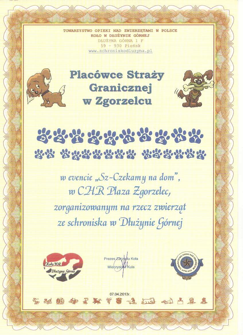 W ostatnią niedzielę tj. 07.04.2013 r. funkcjonariusze Straży Granicznej z Placówki SG w Zgorzelcu wzięli udział w finale akcji charytatywnej na rzecz Schroniska dla Zwierząt Małych w Dłużynie Górnej „Szczekamy na dom”. Akcja ta miała na celu przybliżenie ludziom problemu bezdomności zwierząt, zebranie potrzebnych środków finansowych i karmy, ale przede wszystkim zwiększenie świadomość ludzi na temat świadomej adopcji bezdomnych psów.