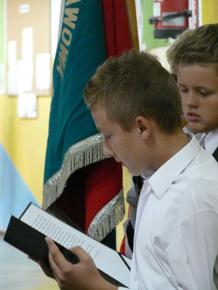 Podczas apelu jeden z uczniów swoim krótkim referatem przypomniał wszystkim jakim trudnym i tragicznym dniem dla uczniów sprzed 74 lat był 1 września. Pamięć o poległych i zamordowanych podczas II wojny światowej uczczono minutą ciszy.