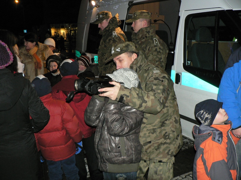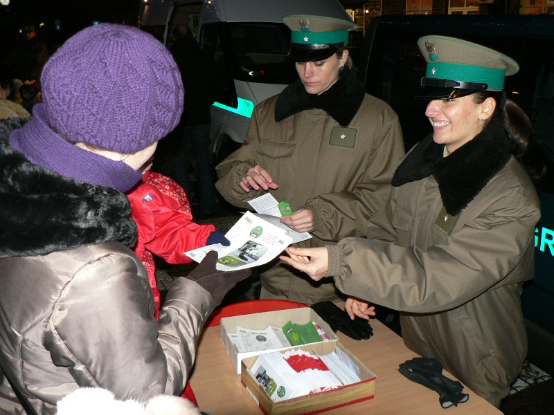 Gryfiński Dom Kultury „Pałacyk pod Lwami” zorganizował 06.12.2010 r. na placu w centrum miasta spotkanie najmłodszych mieszkańców z Mikołajem. Do udziału w wieczornej zabawie zaproszeni zostali funkcjonariusze Placówki Straży Granicznej w Szczecinie. Podczas zabawy zaprezentowali oni dzieciom sprzęt do służby, pojazdy i psy służbowe. Dzieci wzięły udział w konkursie oraz przypomniały sobie jak zachować się w kontakcie z nieznanym psem.